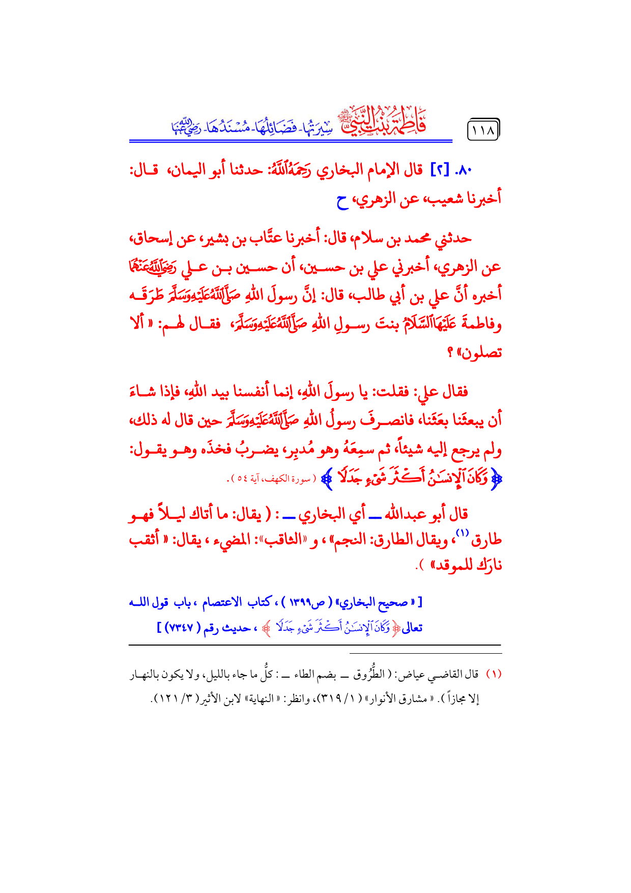 حدثني محمد بن سلام، قال: أخبرنا عتَّاب بن بشير، عن إسحاق، عن الزهري، أخبرني علي بن حسين، أن حسين بن علي - رضي الله عنهما - أخبره أنَّ علي بن أبي طالب، قال: إنَّ رسولَ اللهِ - صلى الله عليه وسلم - طَرَقَه وفاطمةَ - عليها السلام - بنتَ رسولِ اللهِ - صلى الله عليه وسلم -، فقال لهم: «ألا تصلون»؟