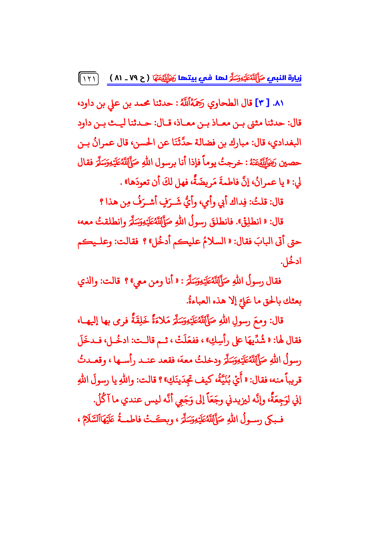 ٨١. [٣] قال الطحاوي - رحمه الله -: حدثنا محمد بن علي بن داود، قال: حدثنا مثنى بن معاذ بن معاذ، قال: حدثنا ليث بن داود البغدادي، قال: مبارك بن فضالة حدَّثَنَا عن الحسن، قال عمرانُ بن حصين - رضي الله عنه -: خرجتُ يوماً فإذا أنا برسول اللهِ - صلى الله عليه وسلم - فقال لي: «يا عمرانُ، إنَّ فاطمةَ مَريضَةٌ، فهل لكَ أن تعودَها».