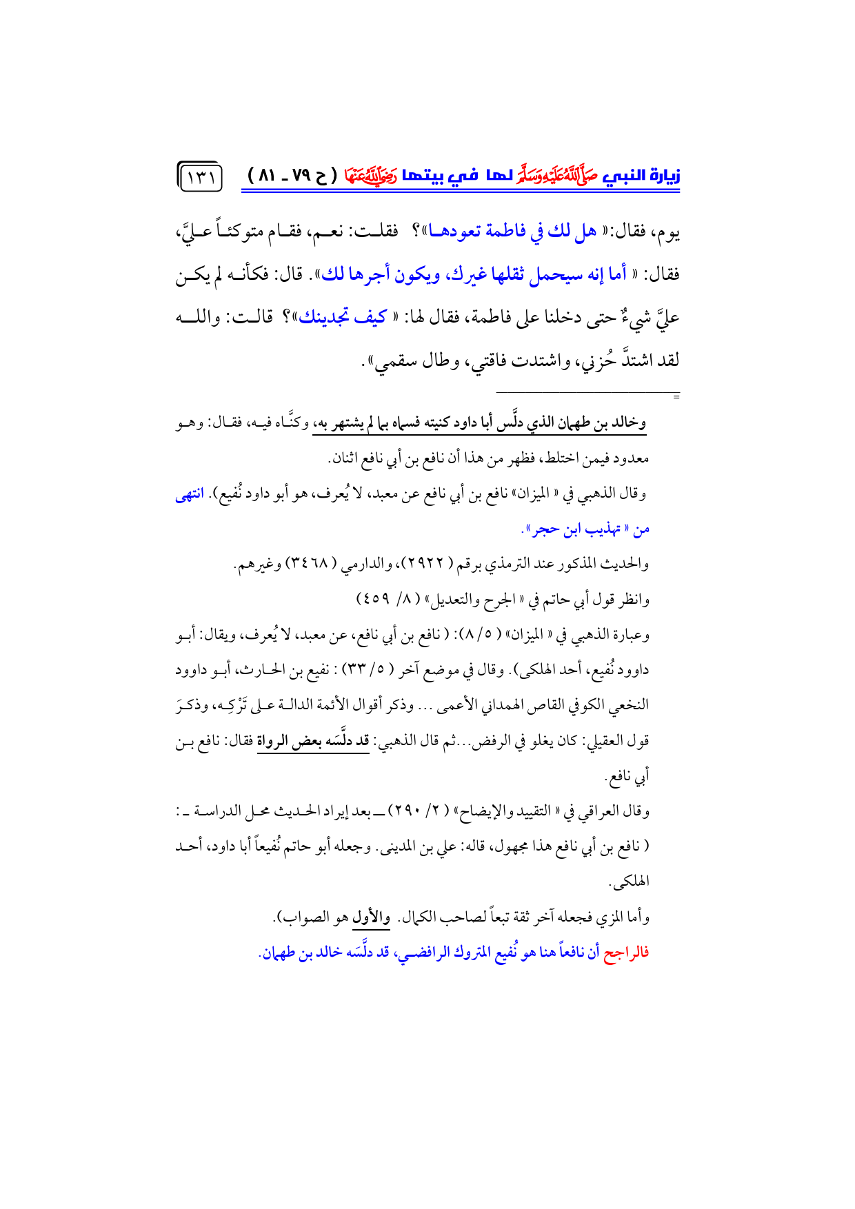 وعبارة الذهبي في «الميزان» (٥/ ٨): (نافع بن أبي نافع، عن معبد، لا يُعرف، ويقال: أبو داوود نُفيع، أحد الهلكى). وقال في موضع آخر (٥/ ٣٣): نفيع بن الحارث، أبو داوود النخعي الكوفي القاص الهمداني الأعمى ... وذكر أقوال الأئمة الدالة على تَرْكِه، وذكرَ قول العقيلي: كان يغلو في الرفض ... ثم قال الذهبي: قد دلَّسَه بعض الرواة فقال: نافع بن أبي نافع.