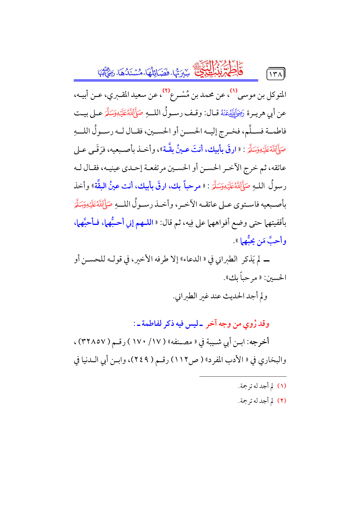 المتوكل بن موسى (¬١)، عن محمد بن مُسْرع (¬٢)، عن سعيد المقبري، عن أبيه، عن أبي هريرة - رضي الله عنه - قال: وقف رسولُ اللهِ - صلى الله عليه وسلم - على بيت فاطمة فسلَّم، فخرج إليه الحسن أو الحسين، فقال له رسولُ اللهِ - صلى الله عليه وسلم -: «ارقَ بأبيك، أنتَ عينُ بقَّة»، وأخذ بأصبعيه، فرَقَى على عاتقه، ثم خرج الآخر الحسن أو الحسين مرتفعة إحدى عينيه، فقال له ... رسولُ اللهِ - صلى الله عليه وسلم -: «مرحباً بك، ارقَ بأبيك، أنت عينُ البقَّة» وأخذ بأصبعيه فاستوى على عاتقه الآخر، وأخذ رسولُ اللهِ - صلى الله عليه وسلم - بأقفيتهما حتى وضع أفواههما على فِيه، ثم قال: «اللهم إني أحبُّهما، فأحبَّهما، وأحبَّ مَن يحبُّهما».