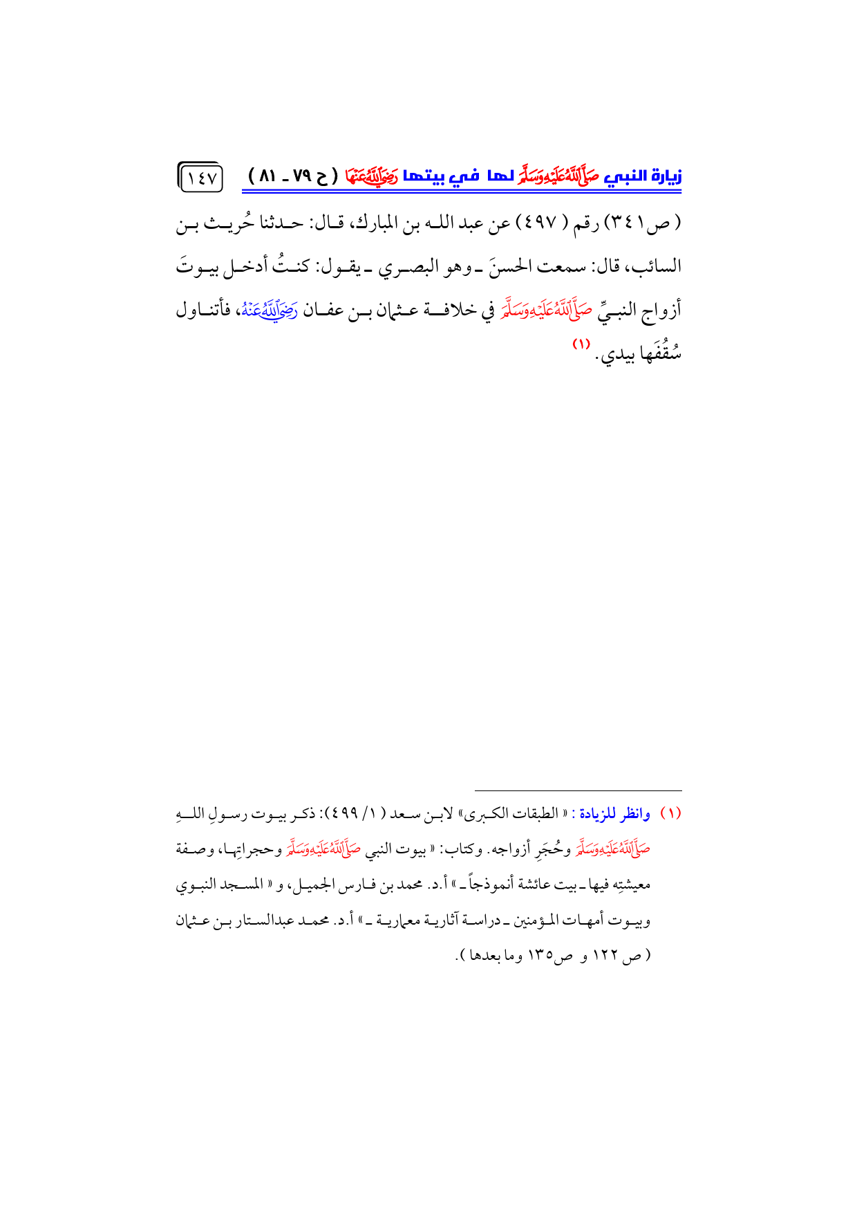 (¬١) وانظر للزيادة: «الطبقات الكبرى» لابن سعد (١/ ٤٩٩): ذكر بيوت رسولِ اللهِ - صلى الله عليه وسلم - وحُجَرِ أزواجه. وكتاب: «بيوت النبي - صلى الله عليه وسلم - وحجراتِها، وصفة معيشتِه فيها ـ بيت عائشة أنموذجاً ـ» أ. د. محمد بن فارس الجميل، و «المسجد النبوي وبيوت أمهات المؤمنين ـ دراسة آثارية معمارية ـ» أ. د. محمد عبدالستار بن عثمان ... (ص ١٢٢ وص ١٣٥ وما بعدها).
