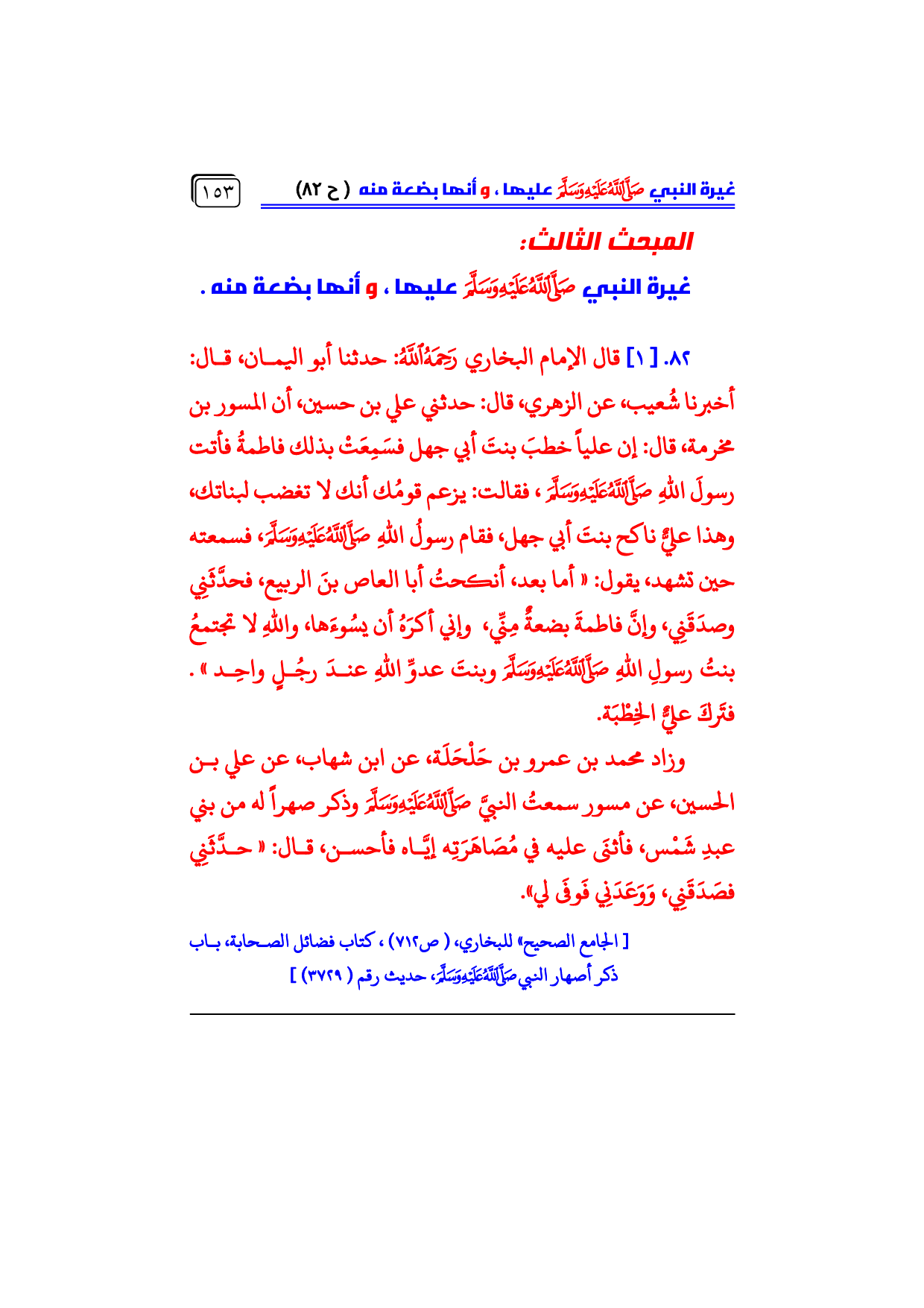 [الجامع الصحيح» للبخاري، (ص ٧١٢)، كتاب فضائل الصحابة، باب ذكر أصهار النبي - صلى الله عليه وسلم -، حديث رقم (٣٧٢٩)]