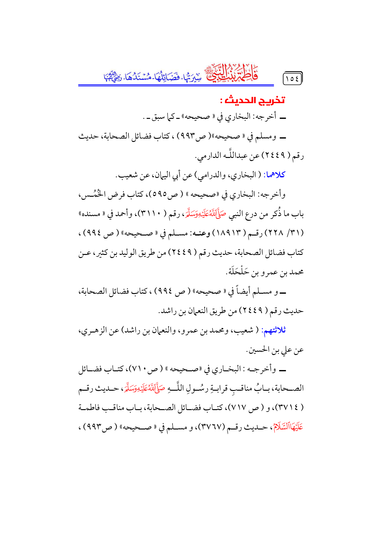 ـ وأخرجه: البخاري في «صحيحه» (ص ٧١٠)، كتاب فضائل الصحابة، بابُ مناقبِ قرابةِ رسُولِ اللَّهِ - صلى الله عليه وسلم -، حديث رقم ... (٣٧١٤)، و (ص ٧١٧)، كتاب فضائل الصحابة، باب مناقب فاطمة - عليها السلام -، حديث رقم (٣٧٦٧)، ومسلم في «صحيحه» (ص ٩٩٣)،