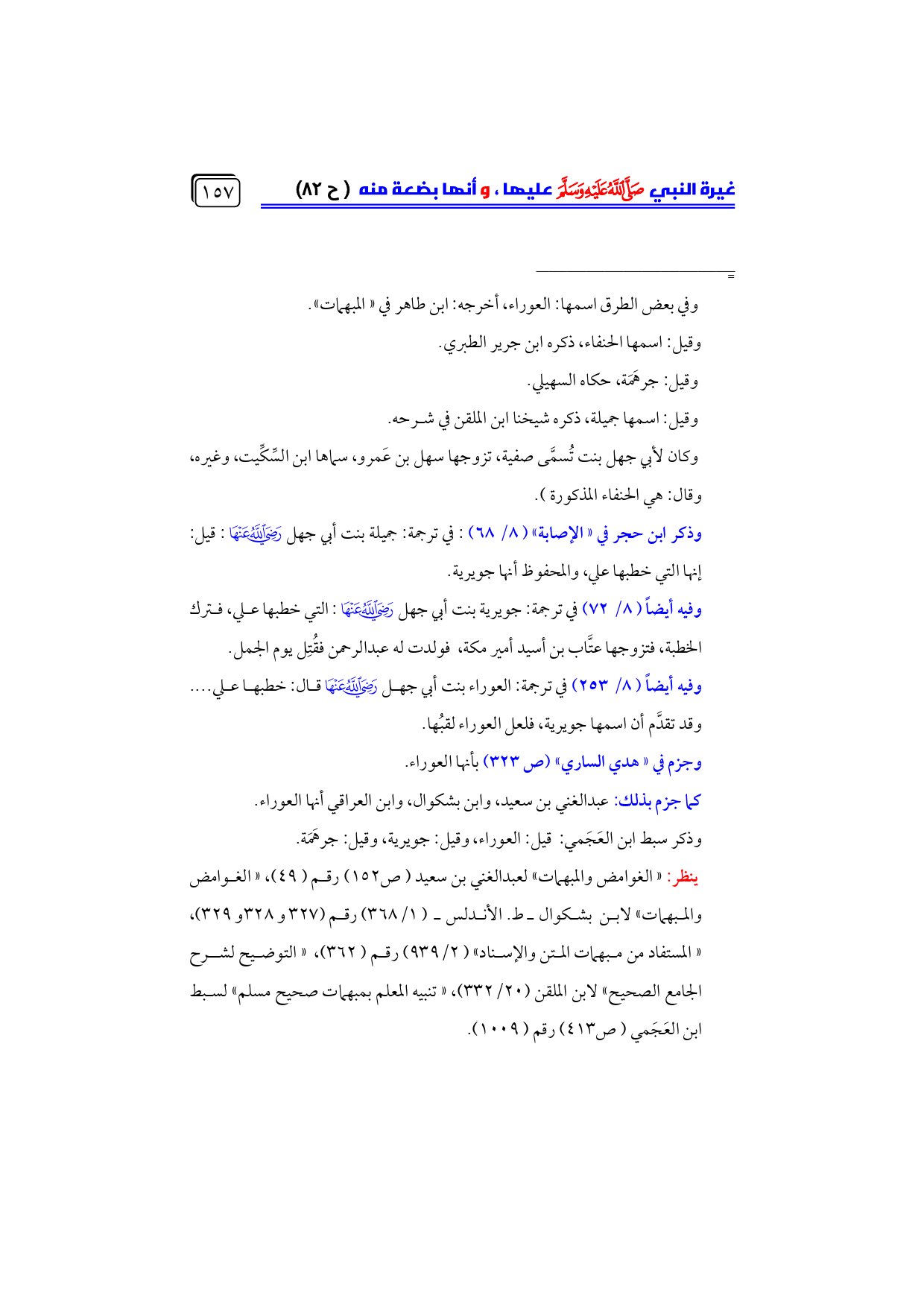 وفيه أيضاً (٨/ ٢٥٣) في ترجمة: العوراء بنت أبي جهل - رضي الله عنها - قال: خطبها علي .... وقد تقدَّم أن اسمها جويرية، فلعل العوراء لقبُها.