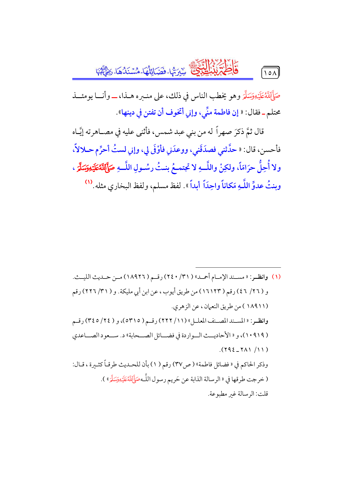 كتاب فاطمة بنت النبي - صلى الله عليه وسلم - سيرتها، فضائلها، مسندها - رضي الله عنها - (اسم الجزء: 4)