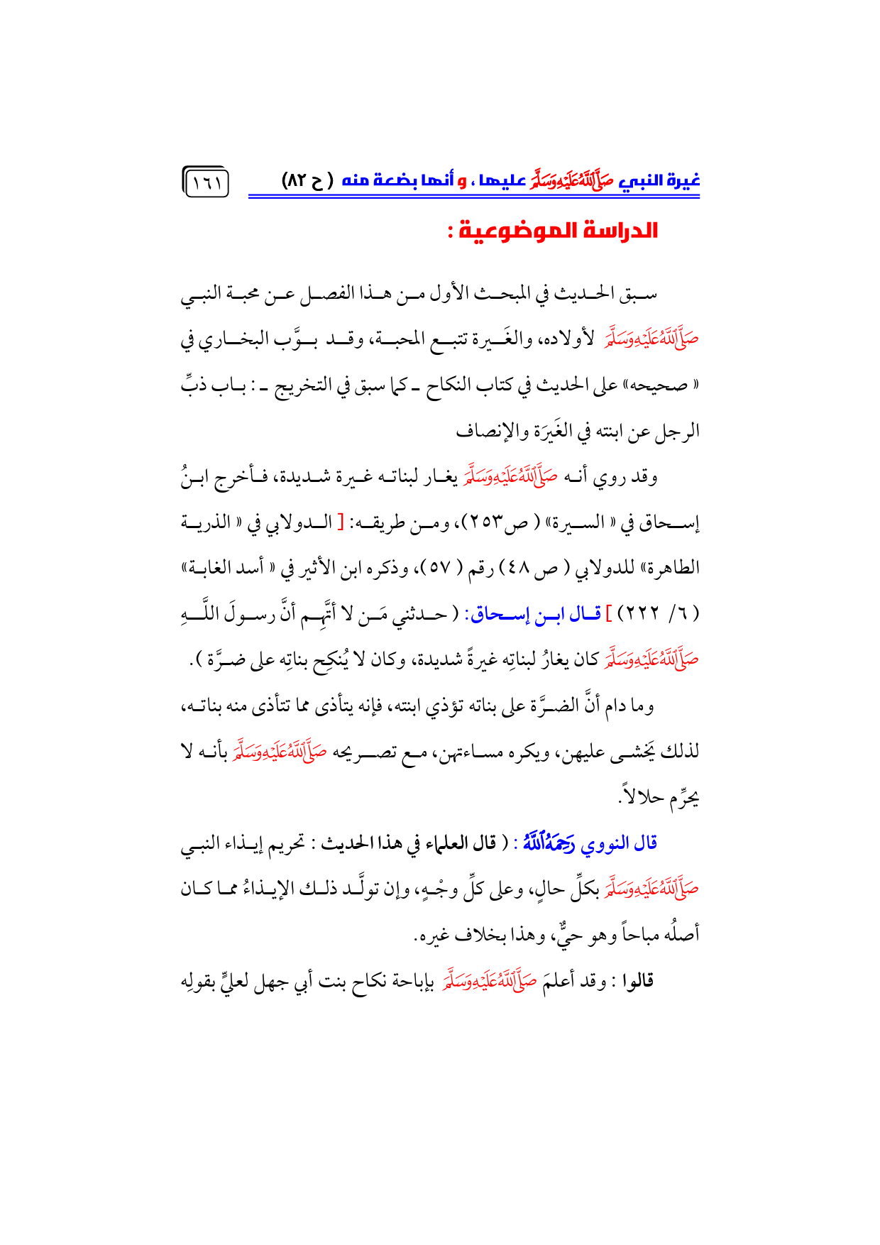 وقد روي أنه - صلى الله عليه وسلم - يغار لبناته غيرة شديدة، فأخرج ابنُ إسحاق في «السيرة» (ص ٢٥٣)، ومن طريقه: [الدولابي في «الذرية الطاهرة» للدولابي (ص ٤٨) رقم (٥٧)، وذكره ابن الأثير في «أسد الغابة» (٦/ ٢٢٢)] قال ابن إسحاق: (حدثني مَن لا أتَّهِم أنَّ رسولَ اللَّهِ - صلى الله عليه وسلم - كان يغارُ لبناتِه غيرةً شديدة، وكان لا يُنكِح بناتِه على ضرَّة).