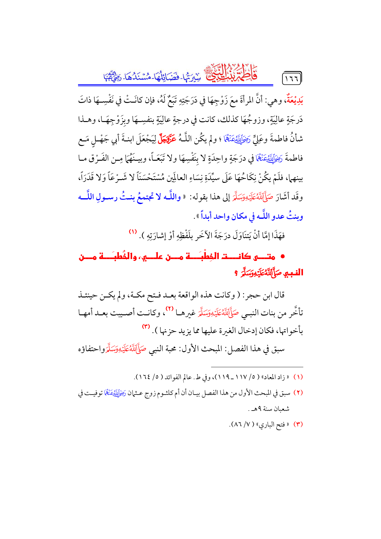 بَدِيْعَةٌ، وهي: أنَّ المرأةَ معَ زَوْجِهَا في دَرَجَتِهِ تَبَعٌ لَهُ، فإن كانَتْ في نَفْسِهَا ذاتَ دَرجَةٍ عالِيَةٍ، وزوجُهَا كذلك، كانت في درجةٍ عالِيَةٍ بنفسِهَا وبِزَوْجِهَا، وهذا شأنُ فاطمةَ وعَلِيٍّ - رضي الله عنهما -؛ ولم يكُن اللَّهُ - عز وجل - لِيَجْعَلَ ابنةَ أبي جَهْلٍ مَع فاطمةَ - رضي الله عنهما - في درَجَةٍ واحِدَةٍ لا بِنَفْسِهَا ولا تَبَعَاً، وبينَهُمَا مِن الفَرْق ما بينهما، فلَمْ يكُنْ نِكَاحُهَا عَلَى سيِّدَةِ نِسَاءِ العالَمِين مُسْتَحْسَنَاً لا شَرْعَاً وَلا قَدَرَاً، وقَد أشَارَ - صلى الله عليه وسلم - إلى هذا بقوله: «واللَّه لا تجتمعُ بنتُ رسولِ اللَّه وبنتُ عدو اللَّه في مكان واحد أبداً».
