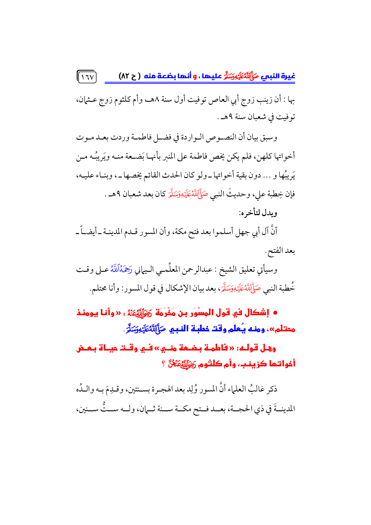 بها: أن زينب زوج أبي العاص توفيت أول سنة ٨ هـ، وأم كلثوم زوج عثمان، توفيت في شعبان سنة ٩ هـ.