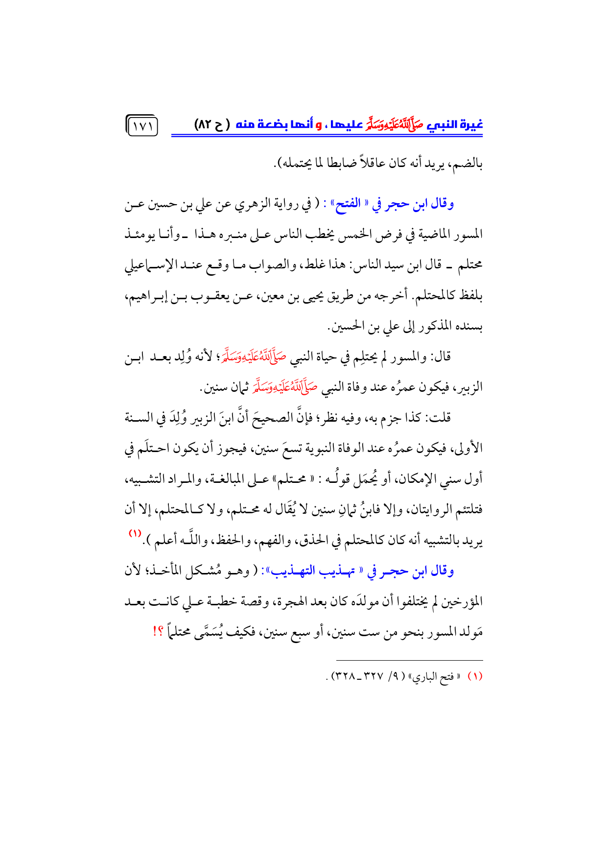 وقال ابن حجر في «الفتح»: (في رواية الزهري عن علي بن حسين عن المسور الماضية في فرض الخمس يخطب الناس على منبره هذا ـ وأنا يومئذ محتلم ـ قال ابن سيد الناس: هذا غلط، والصواب ما وقع عند الإسماعيلي بلفظ كالمحتلم. أخرجه من طريق يحيى بن معين، عن يعقوب بن إبراهيم، بسنده المذكور إلى علي بن الحسين.