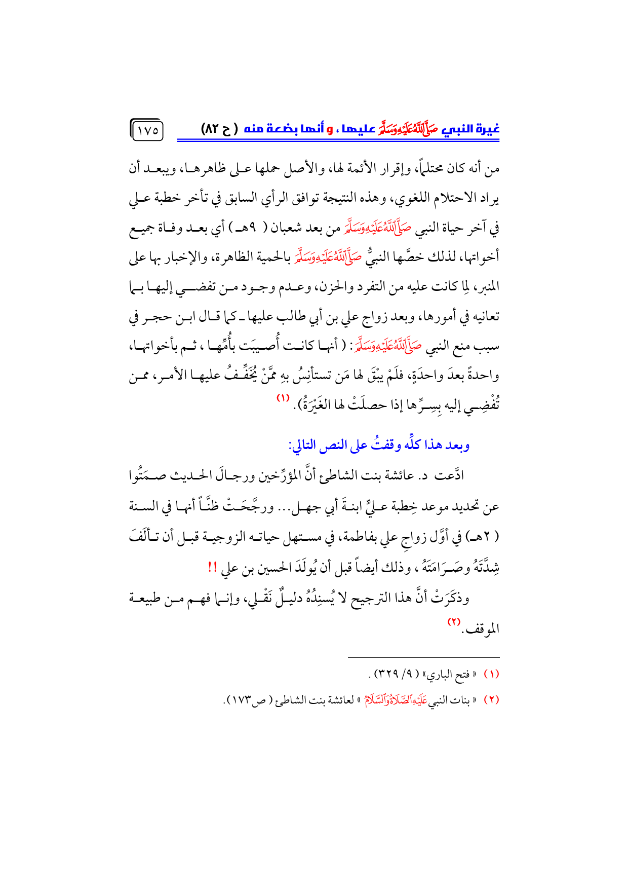 (¬٢) «بنات النبي - عليه الصلاة والسلام -» لعائشة بنت الشاطئ (ص ١٧٣).