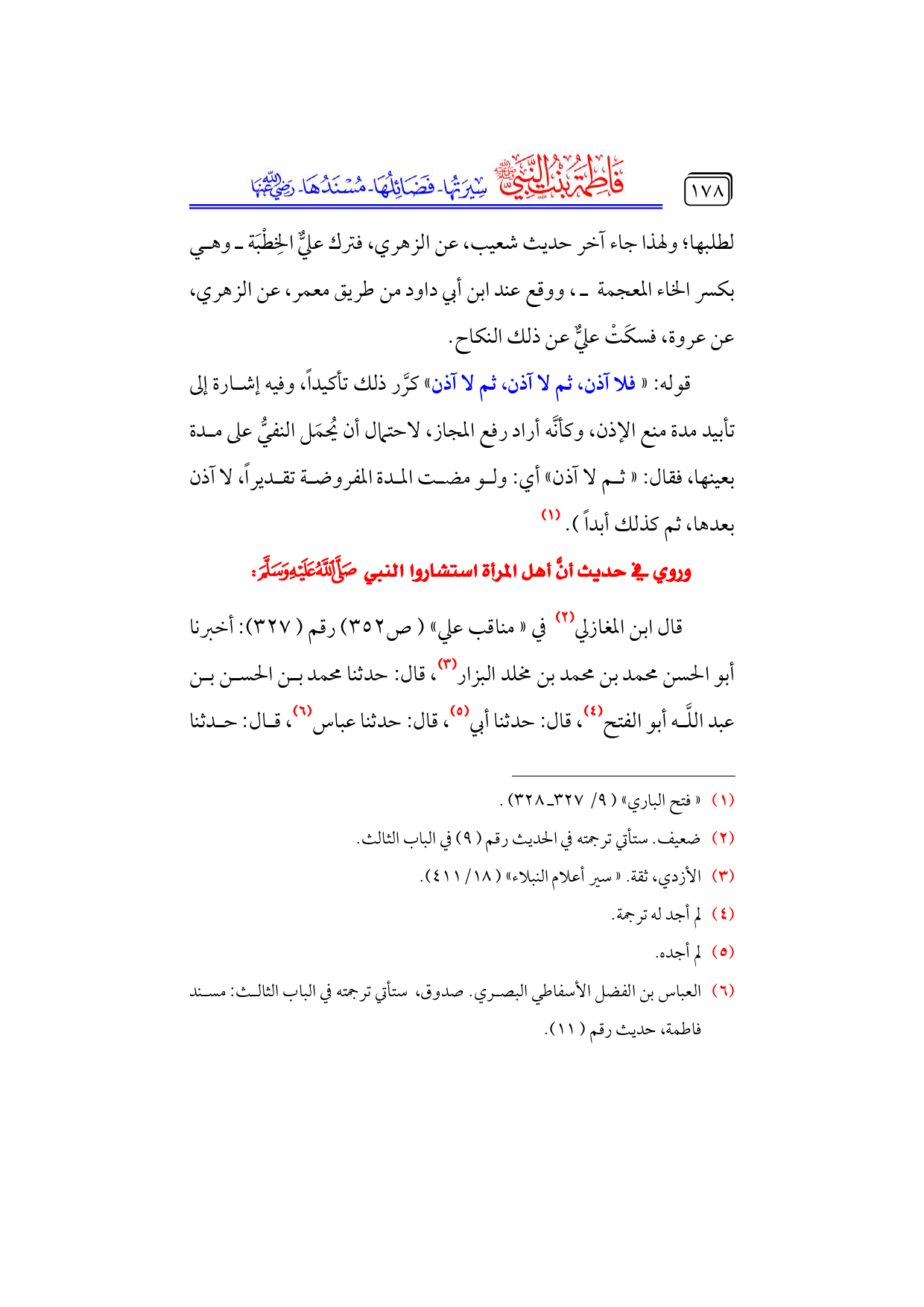 (¬٦) العباس بن الفضل الأسفاطي البصري. صدوق، ستأتي ترجمته في الباب الثالث: مسند فاطمة، حديث رقم (١١).