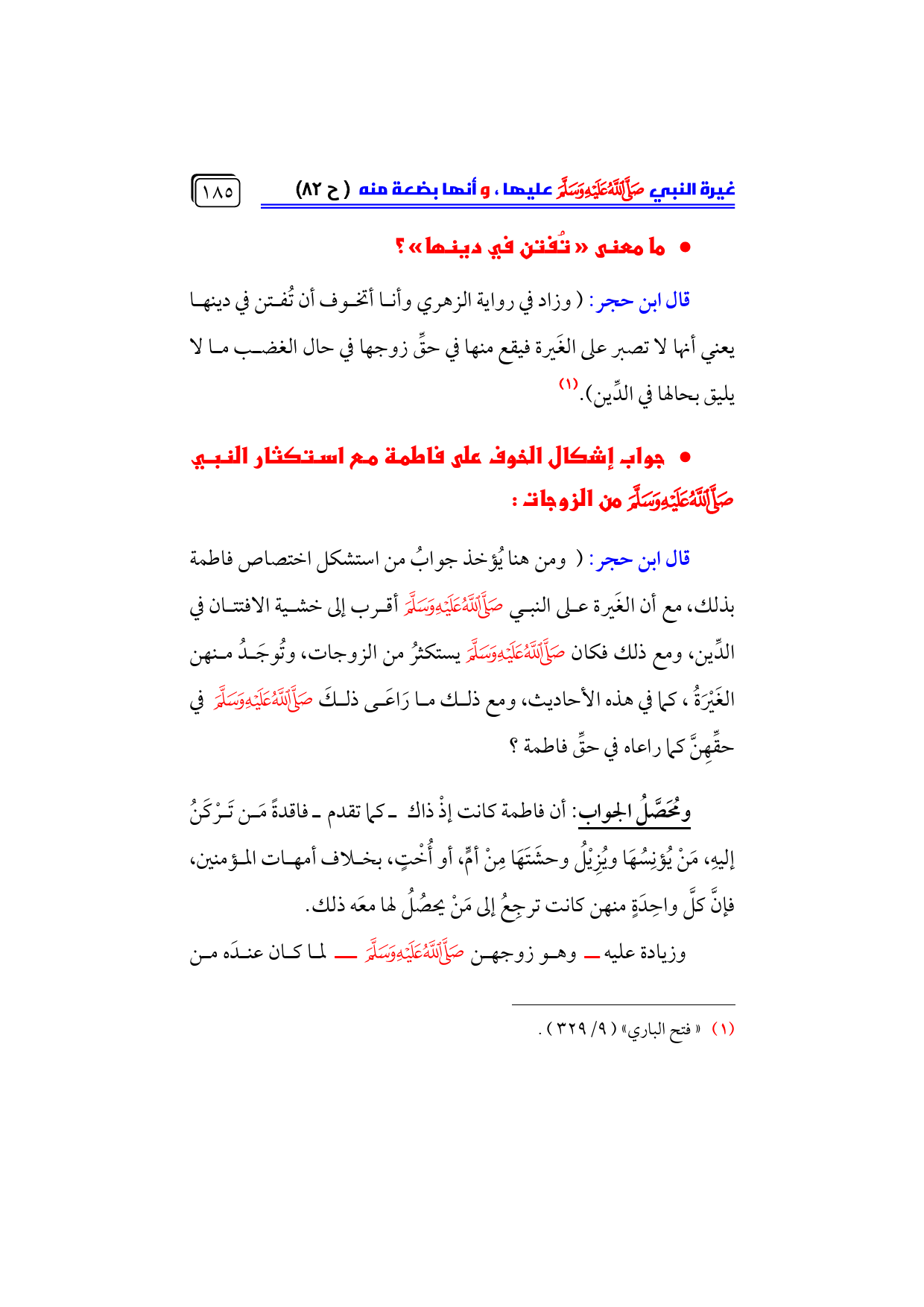 قال ابن حجر: (ومن هنا يُؤخذ جوابُ من استشكل اختصاص فاطمة بذلك، مع أن الغَيرة على النبي - صلى الله عليه وسلم - أقرب إلى خشية الافتتان في الدِّين، ومع ذلك فكان - صلى الله عليه وسلم - يستكثرُ من الزوجات، وتُوجَدُ منهن الغَيْرَةُ، كما في هذه الأحاديث، ومع ذلك ما رَاعَى ذلكَ - صلى الله عليه وسلم - في حقِّهِنَّ كما راعاه في حقِّ فاطمة؟