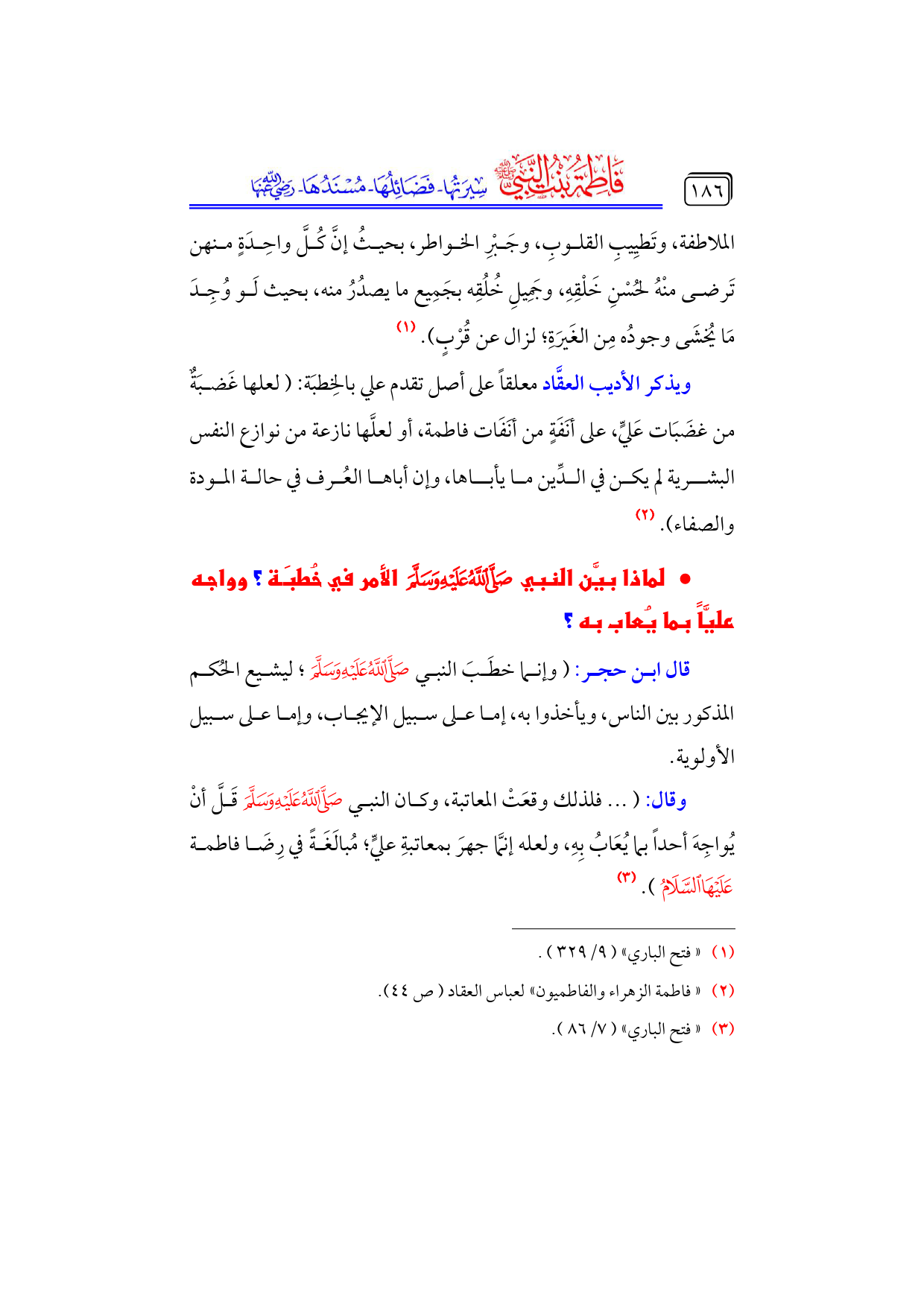 وقال: ( ... فلذلك وقعَتْ المعاتبة، وكان النبي - صلى الله عليه وسلم - قَلَّ أنْ يُواجِهَ أحداً بما يُعَابُ بِهِ، ولعله إنمَّا جهرَ بمعاتبةِ عليٍّ؛ مُبالَغَةً في رِضَا فاطمة - عليها السلام -). (¬٣)