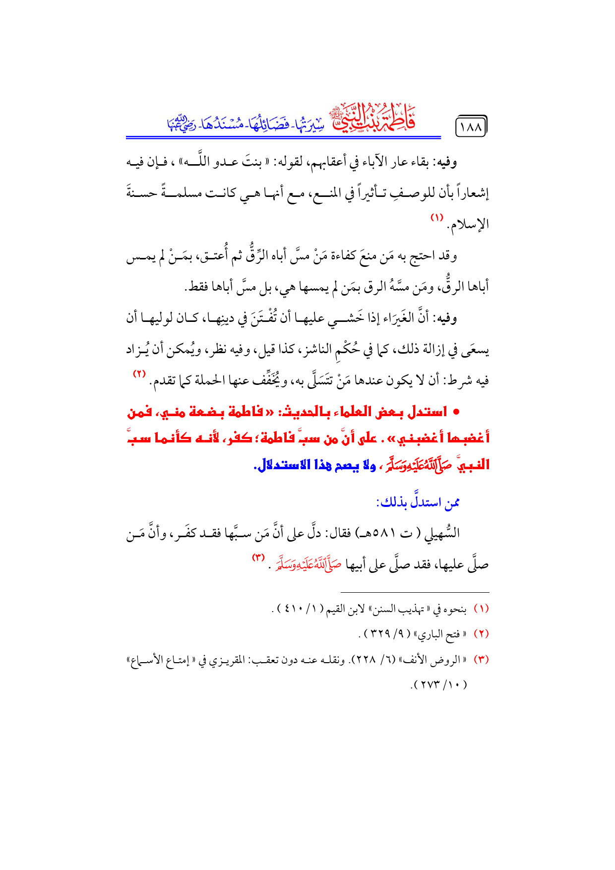 السُّهيلي (ت ٥٨١ هـ) فقال: دلَّ على أنَّ مَن سبَّها فقد كفَر، وأنَّ مَن صلَّى عليها، فقد صلَّى على أبيها - صلى الله عليه وسلم -. (¬٣)