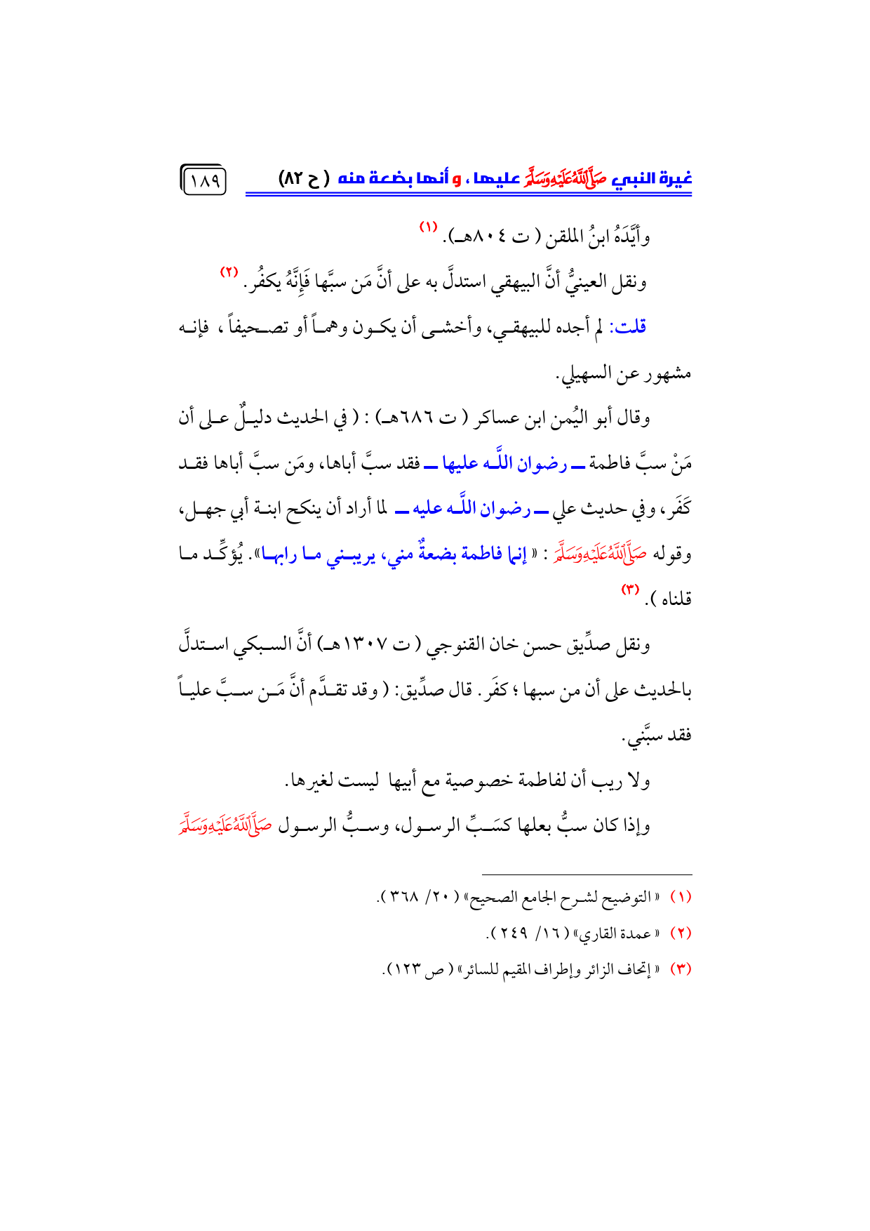 ونقل صدِّيق حسن خان القنوجي (ت ١٣٠٧ هـ) أنَّ السبكي استدلَّ بالحديث على أن من سبها؛ كفَر. قال صدِّيق: (وقد تقدَّم أنَّ مَن سبَّ علياً فقد سبَّني.