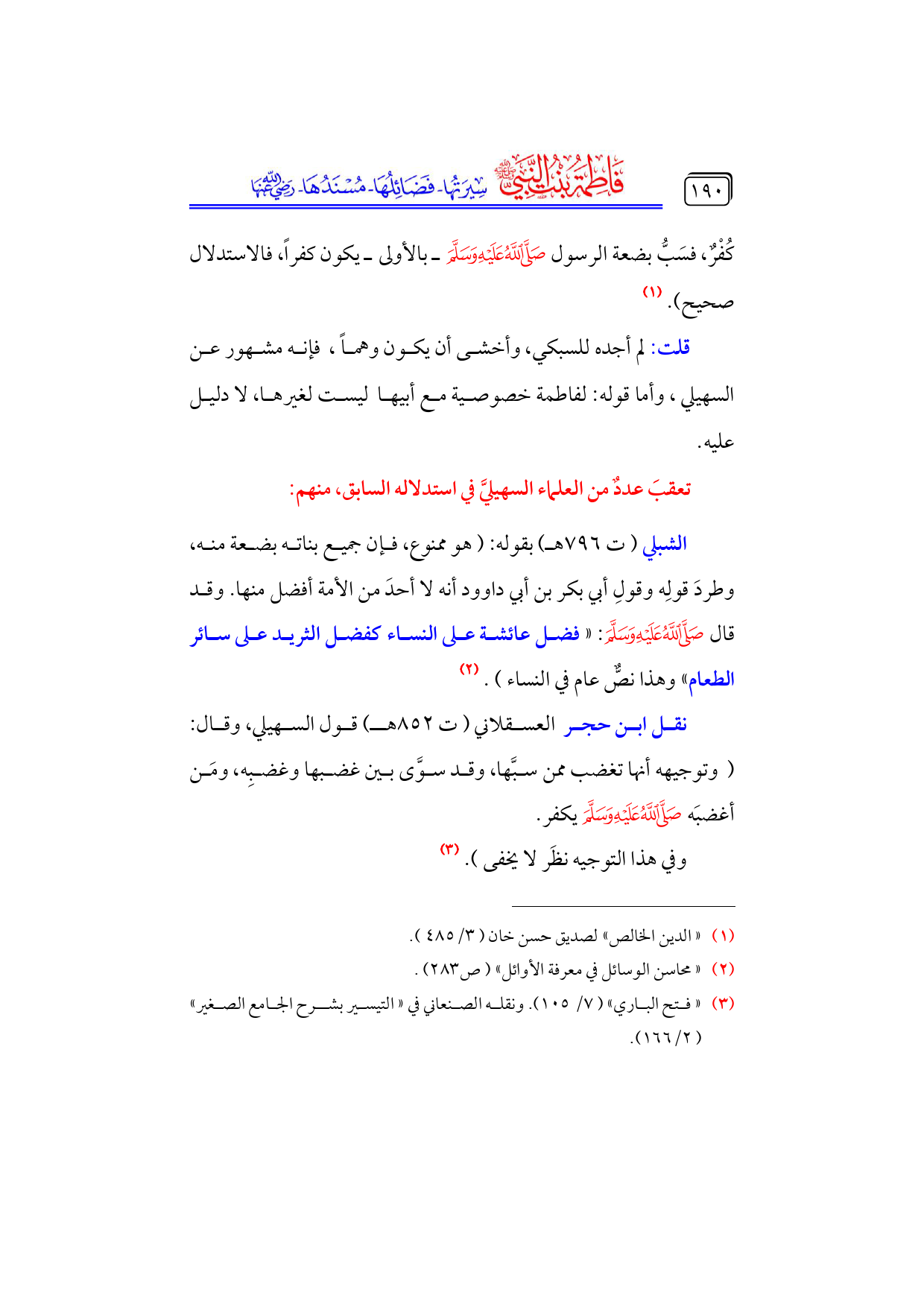 الشبلي (ت ٧٩٦ هـ) بقوله: (هو ممنوع، فإن جميع بناته بضعة منه، وطردَ قولِه وقولِ أبي بكر بن أبي داوود أنه لا أحدَ من الأمة أفضل منها. وقد قال - صلى الله عليه وسلم -: «فضل عائشة على النساء كفضل الثريد على سائر الطعام» وهذا نصٌّ عام في النساء). (¬٢)