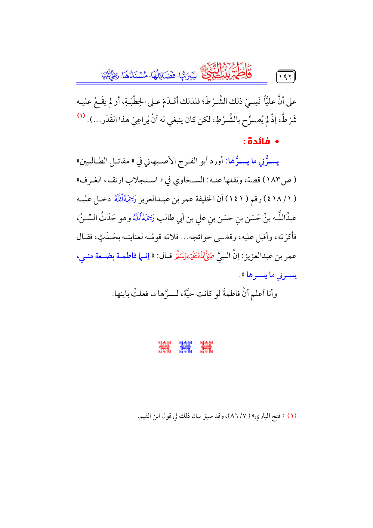 يسرُّني ما يسرُّها: أورد أبو الفرج الأصبهاني في «مقاتل الطالبيين» (ص ١٨٣) قصة، ونقلها عنه: السخاوي في «استجلاب ارتقاء الغرف» (١/ ٤١٨) رقم (١٤١) أن الخليفة عمر بن عبدالعزيز - رحمه الله - دخل عليه عبدُاللَّه بنُ حَسَن بنِ حسَن بنِ علي بن أبي طالب - رحمه الله - وهو حَدَثُ السِّنِّ، فأكرَمَه، وأقبل عليه، وقضى حوائجه فلامَه قومُه لعنايته بحَدَثٍ، فقال عمر بن عبدالعزيز: إنَّ النبيَّ - صلى الله عليه وسلم - قال: «إنما فاطمة بضعة مني، يسرني ما يسرها».