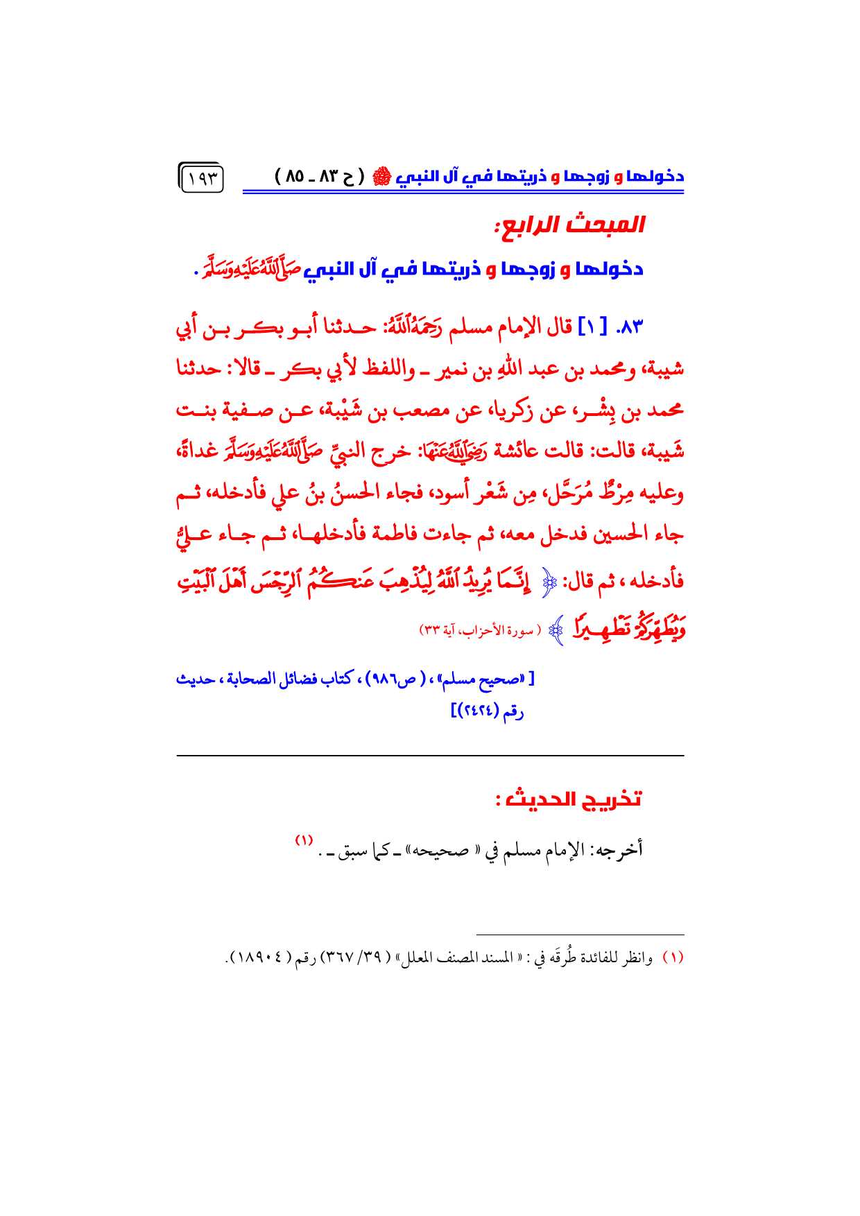٨٢. [١] قال الإمام مسلم - رحمه الله -: حدثنا أبو بكر بن أبي شيبة، ومحمد بن عبد اللهِ بن نمير ـ واللفظ لأبي بكر ـ قالا: حدثنا محمد بن بِشْر، عن زكريا، عن مصعب بن شَيْبة، عن صفية بنت شَيبة، قالت: قالت عائشة - رضي الله عنها -: خرج النبيِّ - صلى الله عليه وسلم - غداةً، وعليه مِرْطٌ مُرَحَّل، مِن شَعْر أسود، فجاء الحسنُ بنُ علي فأدخله، ثم جاء الحسين فدخل معه، ثم جاءت فاطمة فأدخلها، ثم جاء عليُّ فأدخله، ثم قال: { ... إِنَّمَا يُرِيدُ اللَّهُ لِيُذْهِبَ عَنْكُمُ الرِّجْسَ أَهْلَ الْبَيْتِ وَيُطَهِّرَكُمْ تَطْهِيرًا} (سورة الأحزاب، آية ٣٣)