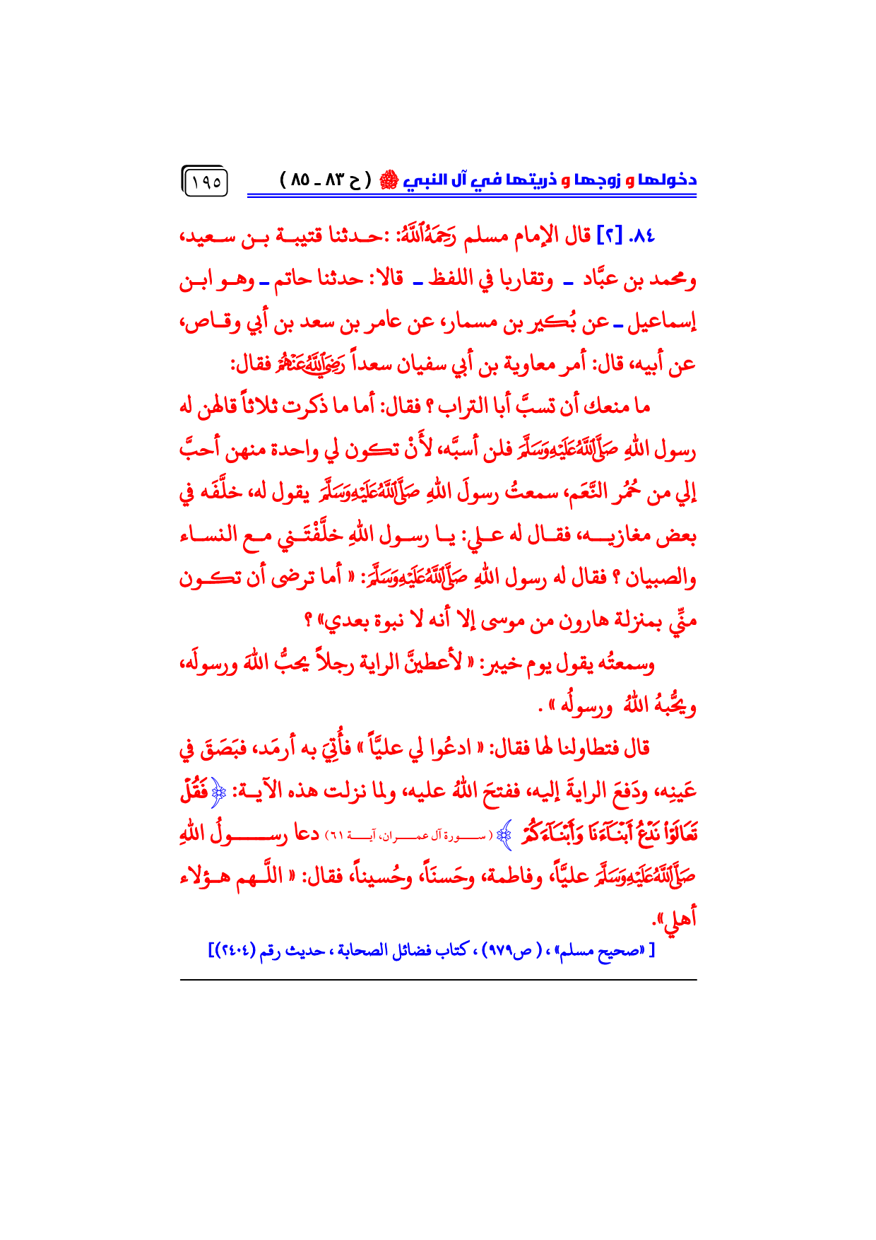 قال فتطاولنا لها فقال: «ادعُوا لي عليَّاً» فأُتِيَ به أرمَد، فبَصَقَ في عَينِه، ودَفعَ الرايةَ إليه، ففتحَ اللهُ عليه، ولما نزلت هذه الآية: {فَقُلْ تَعَالَوْا نَدْعُ أَبْنَاءَنَا وَأَبْنَاءَكُمْ} (سورة آل عمران، آية ٦١) دعا رسولُ اللهِ - صلى الله عليه وسلم - عليَّاً، وفاطمة، وحَسنَاً، وحُسيناً، فقال: «اللَّهم هؤلاء أهلي».