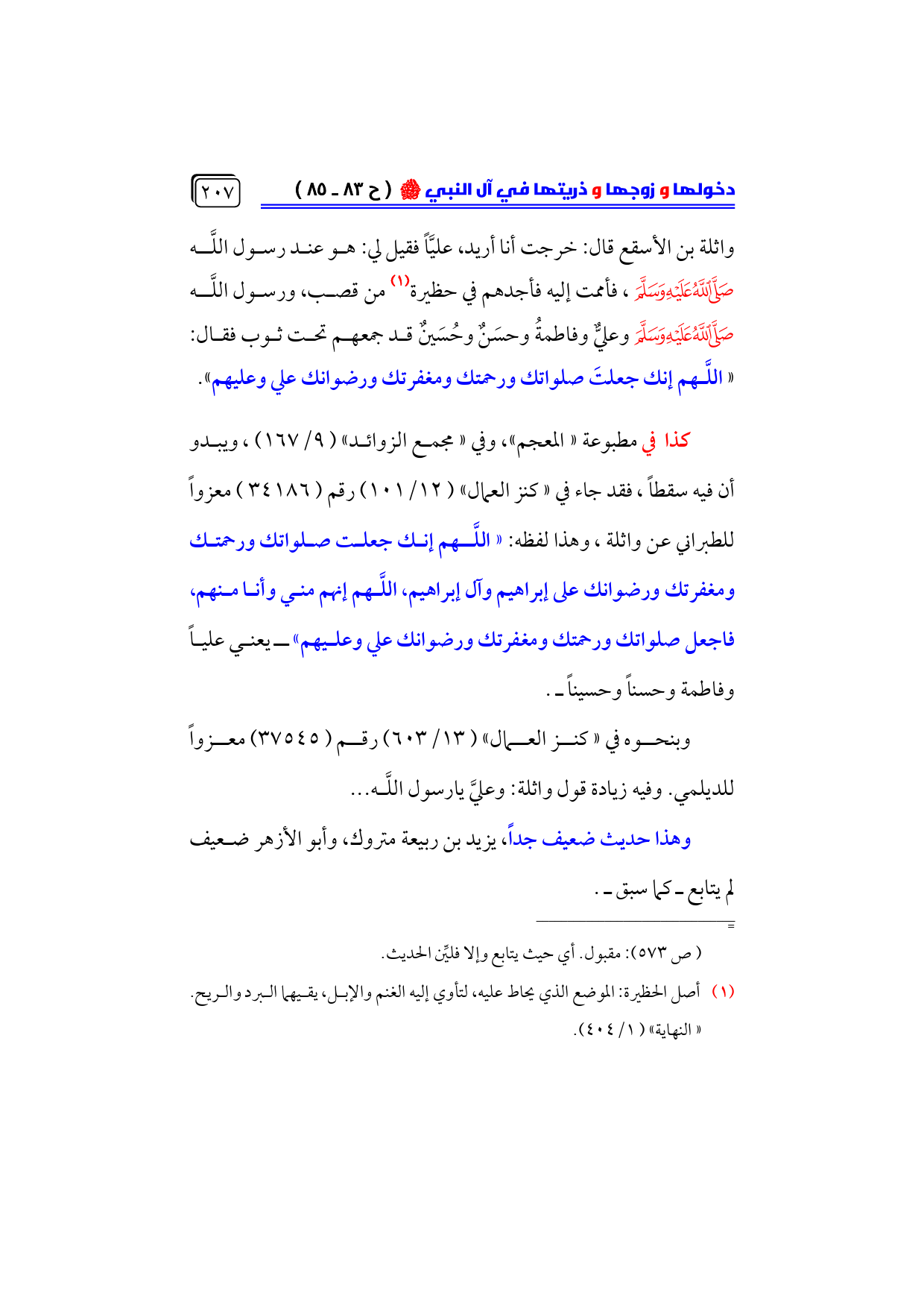 كذا في مطبوعة «المعجم»، وفي «مجمع الزوائد» (٩/ ١٦٧)، ويبدو أن فيه سقطاً، فقد جاء في «كنز العمال» (١٢/ ١٠١) رقم (٣٤١٨٦) معزواً للطبراني عن واثلة، وهذا لفظه: «اللَّهم إنك جعلت صلواتك ورحمتك ومغفرتك ورضوانك على إبراهيم وآل إبراهيم، اللَّهم إنهم مني وأنا منهم، فاجعل صلواتك ورحمتك ومغفرتك ورضوانك علي وعليهم» ـ يعني علياً وفاطمة وحسناً وحسيناً ـ.