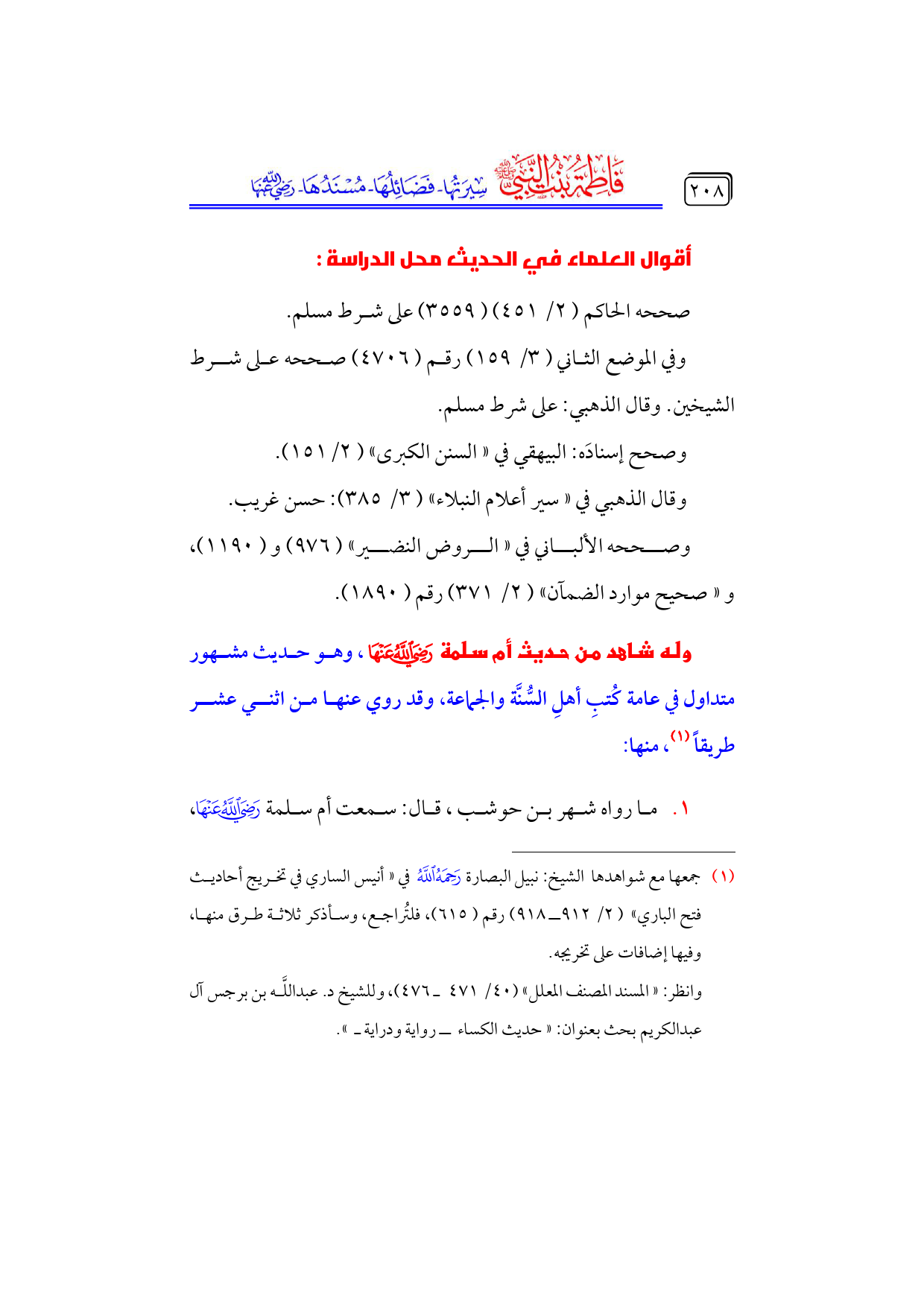 ١. ما رواه شهر بن حوشب، قال: سمعت أم سلمة - رضي الله عنها -،