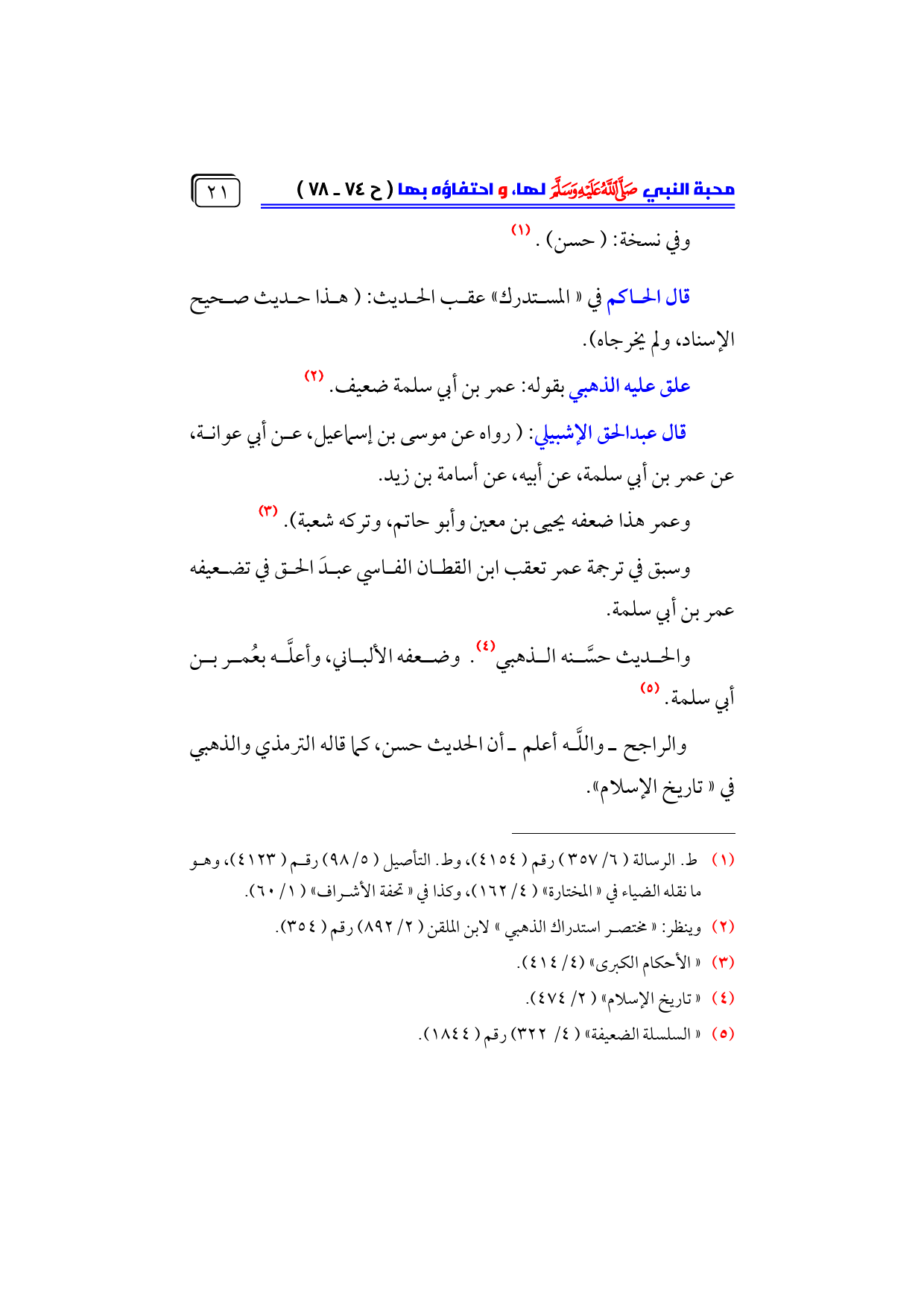 والحديث حسَّنه الذهبي (¬٤). وضعفه الألباني، وأعلَّه بعُمر بن أبي سلمة. (¬٥)