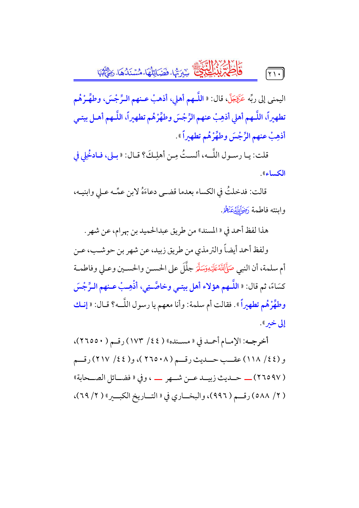 ولفظ أحمد أيضاً والترمذي من طريق زبيد، عن شهر بن حوشب، عن أم سلمة، أن النبي - صلى الله عليه وسلم - جلَّلَ على الحسن والحسين وعلي وفاطمة كسَاءً، ثم قال: «اللَّهم هؤلاء أهل بيتي وخاصَّتِي، أذْهِبْ عنهم الرِّجْسَ وطهِّرْهُم تطهيراً». فقالت أم سلمة: وأنا معهم يا رسول اللَّه؟ قال: «إنك إلى خير».