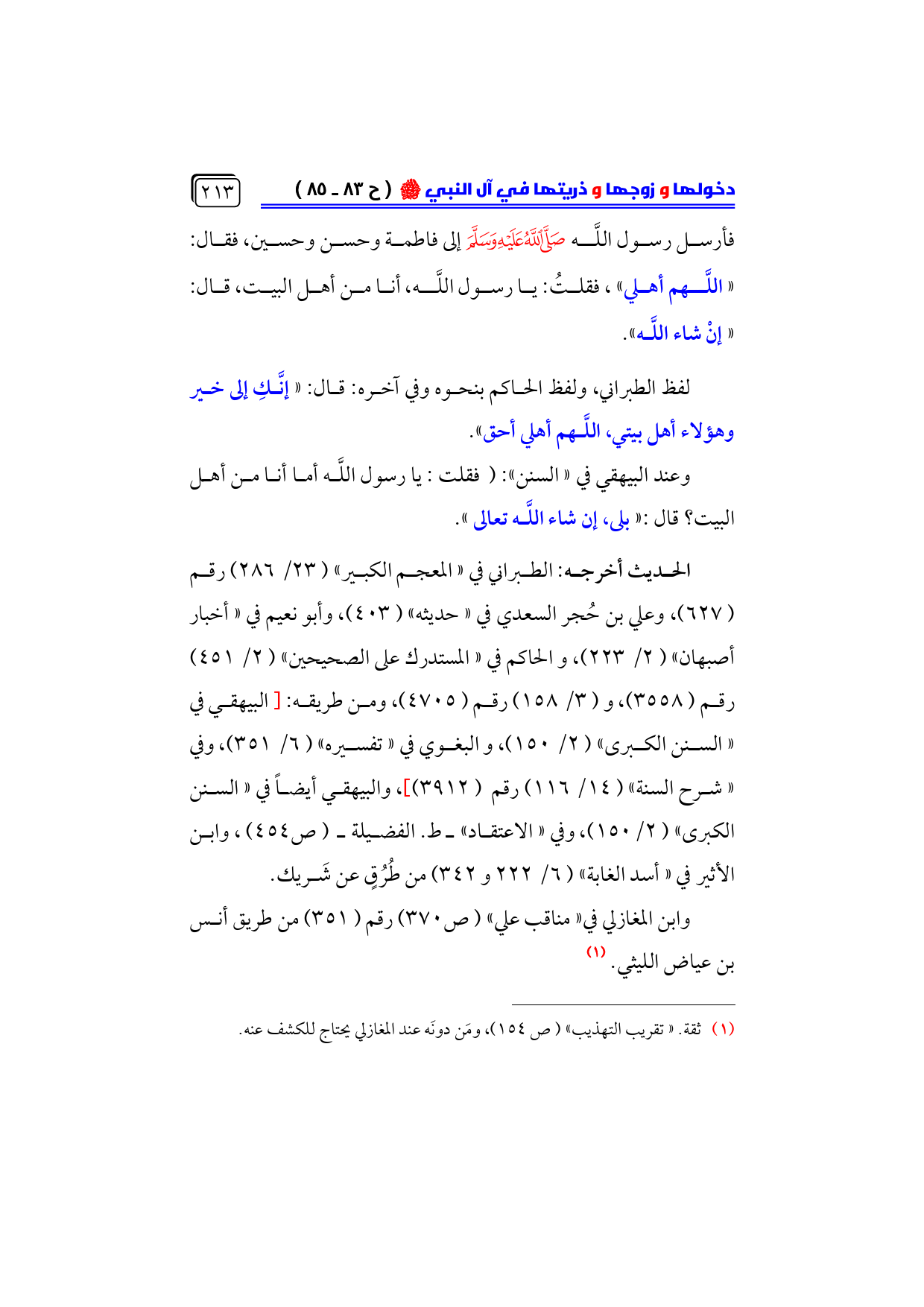 فأرسل رسول اللَّه - صلى الله عليه وسلم - إلى فاطمة وحسن وحسين، فقال: ... «اللَّهم أهلي»، فقلتُ: يا رسول اللَّه، أنا من أهل البيت، قال: ... «إنْ شاء اللَّه».