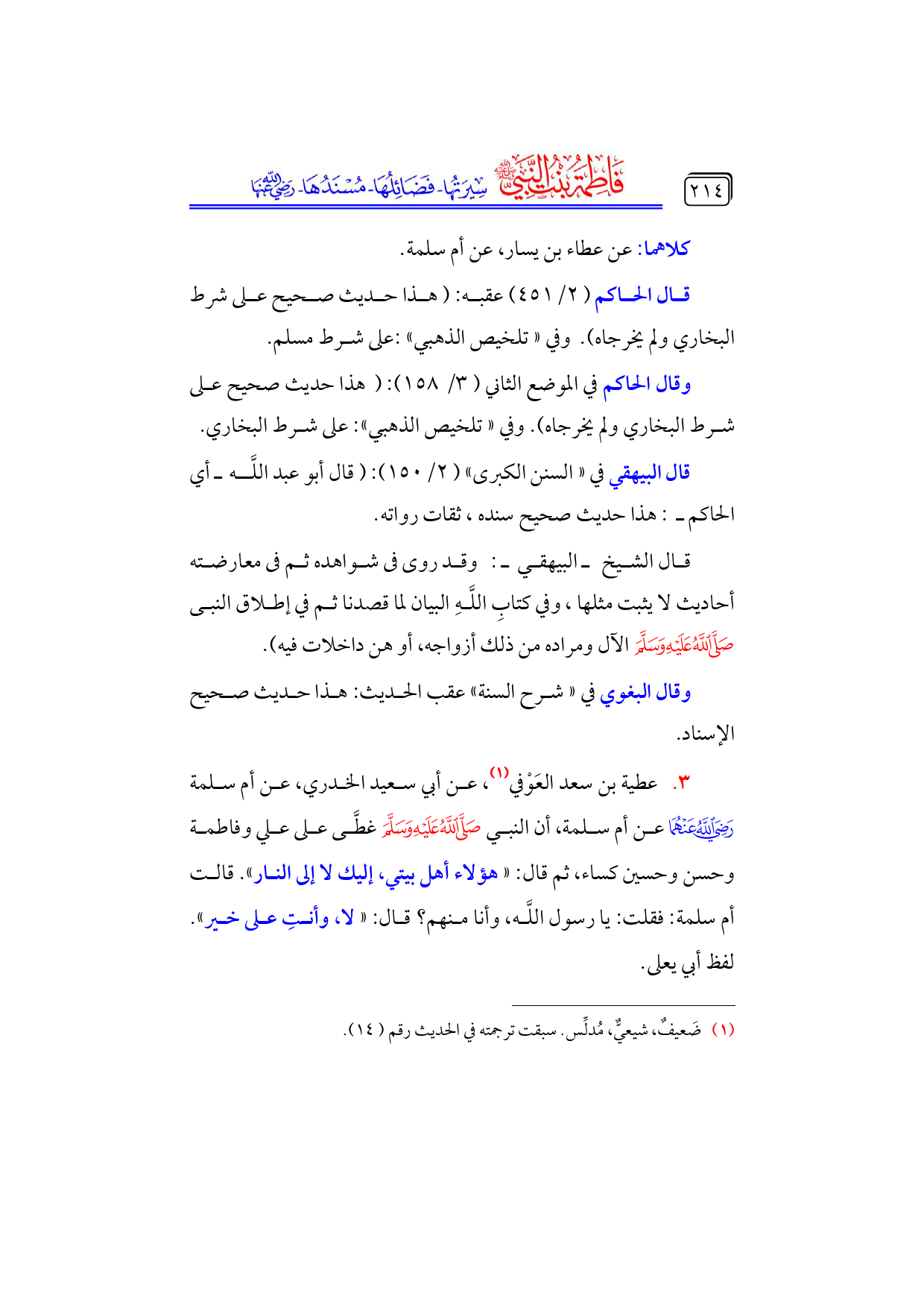 ٣. عطية بن سعد العَوْفي (¬١)، عن أبي سعيد الخدري، عن أم سلمة - رضي الله عنهما - عن أم سلمة، أن النبي - صلى الله عليه وسلم - غطَّى على علي وفاطمة وحسن وحسين كساء، ثم قال: «هؤلاء أهل بيتي، إليك لا إلى النار». قالت أم سلمة: فقلت: يا رسول اللَّه، وأنا منهم؟ قال: «لا، وأنتِ على خير». ... لفظ أبي يعلى.
