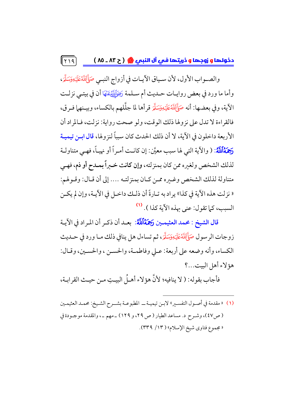 والصواب الأول، لأن سياق الآيات في أزواج النبي - صلى الله عليه وسلم -، وأما ما ورد في بعض روايات حديث أم سلمة - رضي الله عنها - أن في بيتي نزلت الآية، وفي بعضها: أنه - صلى الله عليه وسلم - قرأها لما جلَّلهم بالكساء، وبينهما فرق، فالقراءة لا تدل على نزولها ذلك الوقت، ولو صحت رواية: نزلت، فالمراد أن الأربعة داخلون في الآية، لا أن ذلك الحدث كان سبباً لنزولها، قال ابن تيمية - رحمه الله -: (والآية التي لها سبب معيَّن: إن كانت أمراً أو نهياً، فهي متناولة لذلك الشخص ولغيره ممن كان بمنزلته، وإن كانت خبراً بمدح أو ذم، فهي متناولة لذلك الشخص وغيره ممن كان بمنزلته .... إلى أن قال: وقولهم: ... «نزلت هذه الآية في كذا» يراد به تارةً أن ذلك داخل في الآية، وإن لم يكن السبب، كما تقول: عنى بهذه الآية كذا). (¬١)