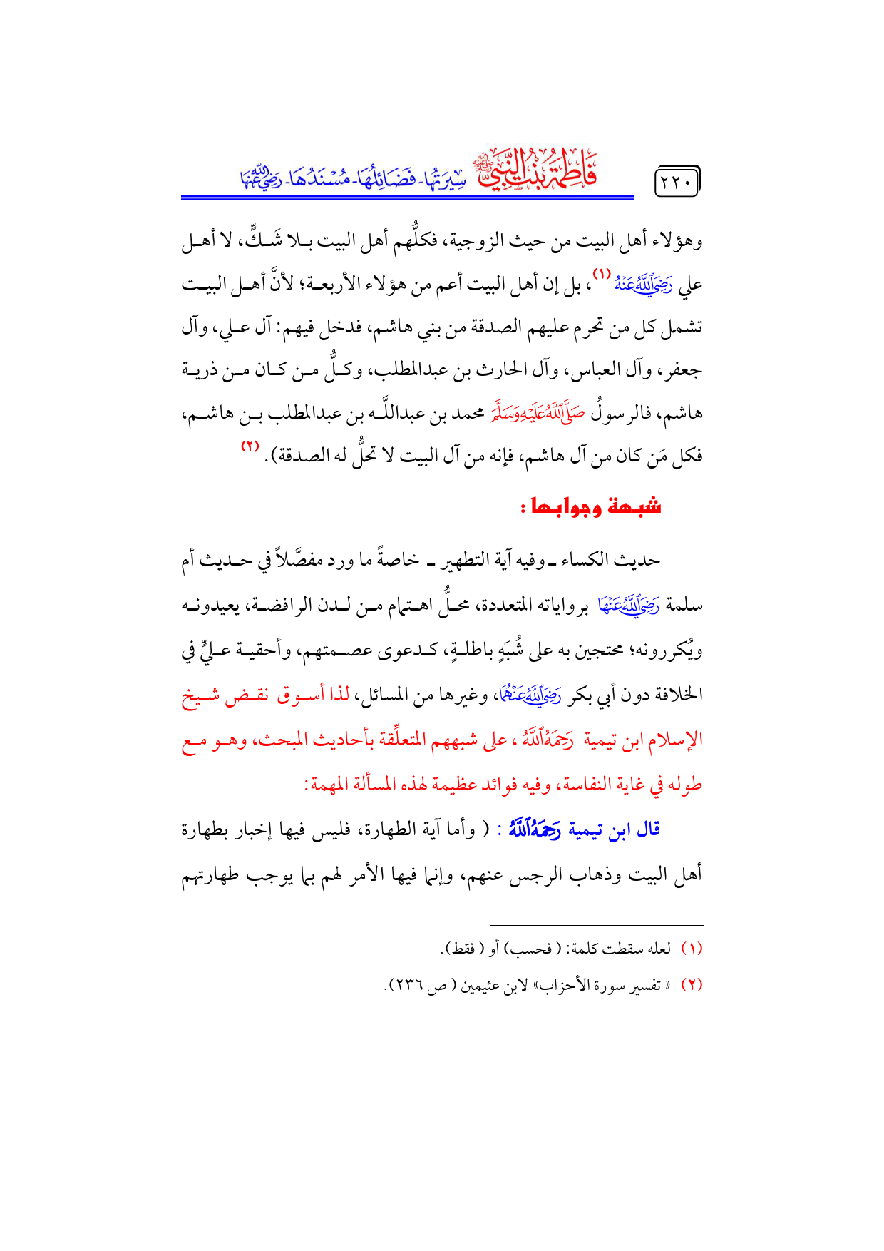 وهؤلاء أهل البيت من حيث الزوجية، فكلُّهم أهل البيت بلا شَكٍّ، لا أهل علي - رضي الله عنه - (¬١)، بل إن أهل البيت أعم من هؤلاء الأربعة؛ لأنَّ أهل البيت تشمل كل من تحرم عليهم الصدقة من بني هاشم، فدخل فيهم: آل علي، وآل جعفر، وآل العباس، وآل الحارث بن عبدالمطلب، وكلُّ من كان من ذرية هاشم، فالرسولُ - صلى الله عليه وسلم - محمد بن عبداللَّه بن عبدالمطلب بن هاشم، فكل مَن كان من آل هاشم، فإنه من آل البيت لا تحلُّ له الصدقة). (¬٢)