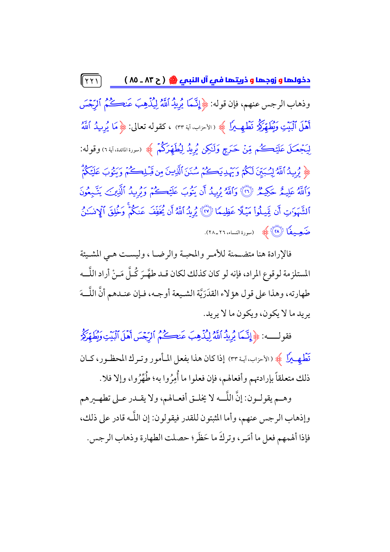 فقوله: {إِنَّمَا يُرِيدُ اللَّهُ لِيُذْهِبَ عَنْكُمُ الرِّجْسَ أَهْلَ الْبَيْتِ وَيُطَهِّرَكُمْ تَطْهِيرًا} (الأحزاب، آية ٣٣) إذا كان هذا بفعل المأمور وترك المحظور، كان ذلك متعلقاً بإرادتهم وأفعالهم، فإن فعلوا ما أُمِرُوا به؛ طُهِّرُوا، وإلا فلا.