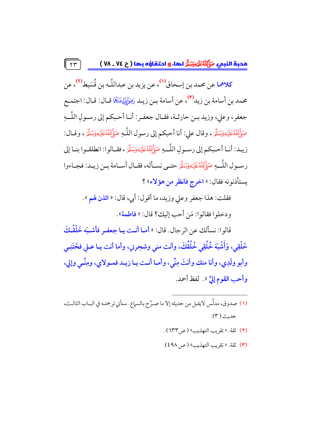 كلاهما عن محمد بن إسحاق (¬١)، عن يزيد بن عبداللَّه بن قُسَيط (¬٢)، عن محمد بن أسامة بن زيد (¬٣)، عن أسامة بن زيد - رضي الله عنهما - قال: قال: اجتمع جعفر، وعلي، وزيد بن حارثة، فقال جعفر: أنا أحبكم إلى رسولِ اللَّهِ - صلى الله عليه وسلم -، وقال علي: أنا أحبكم إلى رسول اللَّهِ - صلى الله عليه وسلم -، وقال: زيد: أنا أحبكم إلى رسولِ اللَّهِ - صلى الله عليه وسلم -، فقالوا: انطلقوا بنا إلى ... رسول اللَّهِ - صلى الله عليه وسلم - حتى نسأله، فقال أسامة بن زيد: فجاءوا يستأذنونه فقال: «اخرج فانظر من هؤلاء»؟