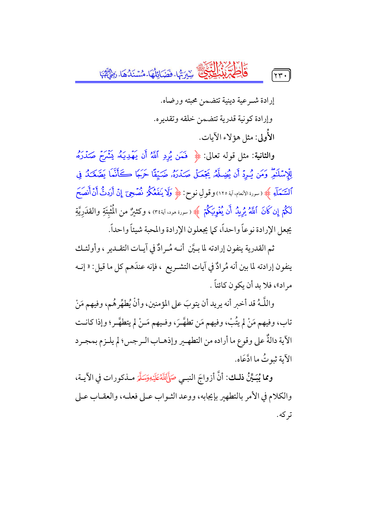 ثم القدرية ينفون إرادته لما بيَّن أنه مُرادٌ في آيات التقدير، وأولئك ينفون إرادته لما بين أنه مُرادٌ في آيات التشريع، فإنه عندَهم كل ما قيل: «إنه مراد»، فلا بد أن يكون كائناً.