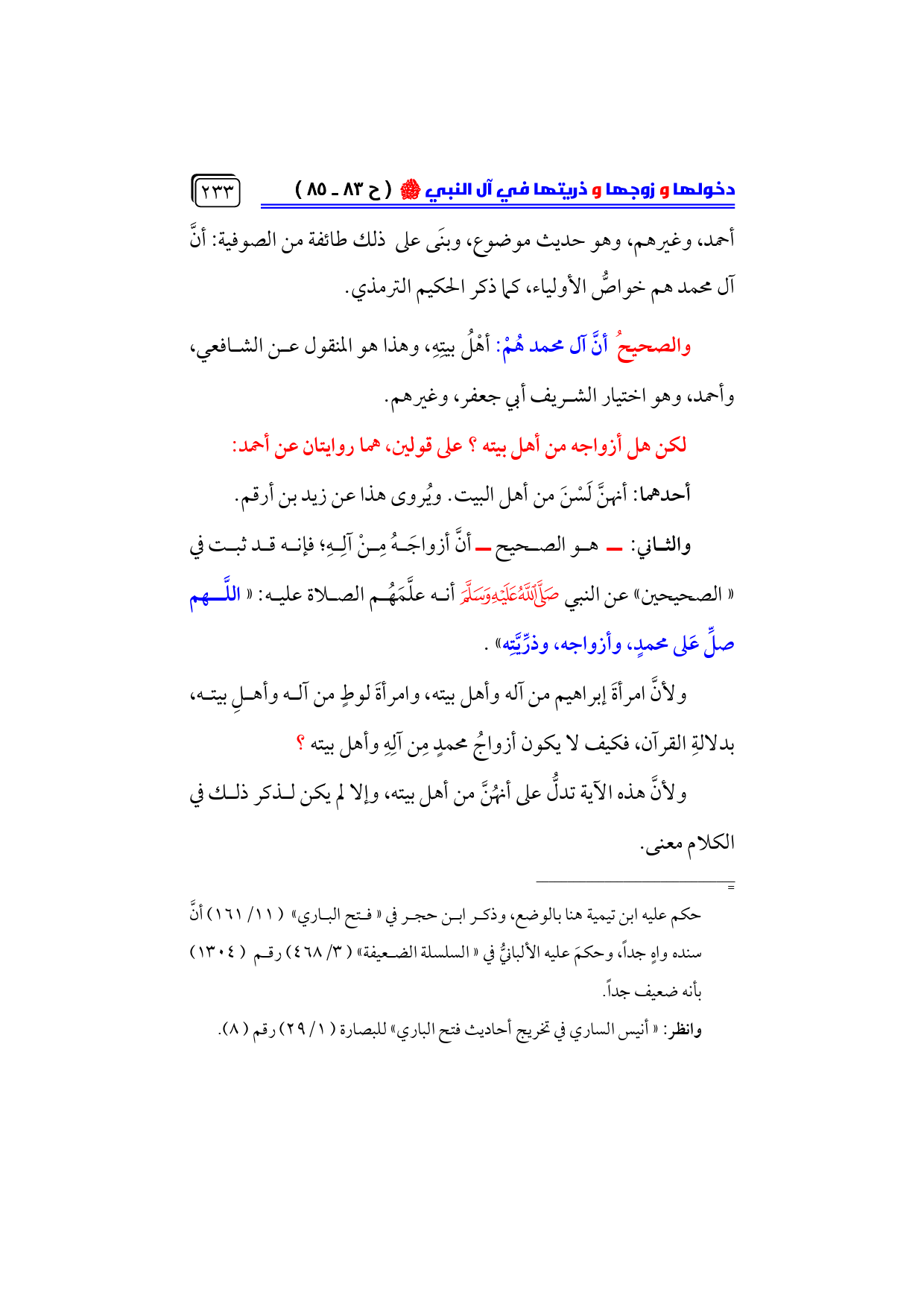 والثاني: ـ هو الصحيح ـ أنَّ أزواجَهُ مِنْ آلِهِ؛ فإنه قد ثبت في ... «الصحيحين» عن النبي - صلى الله عليه وسلم - أنه علَّمَهُم الصلاة عليه: «اللَّهم صلِّ عَلى محمدٍ، وأزواجه، وذرِّيَّتِه».