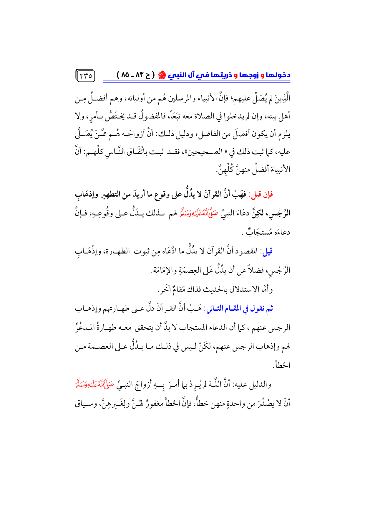 قيل: المقصود أنَّ القرآن لا يدُلُّ ما ادَّعَاه مِن ثبوت الطهارة، وإذْهَابِ الرِّجْسِ، فضلاً عن أن يدُلَّ عَلى العِصمَةِ والإمَامَة.
