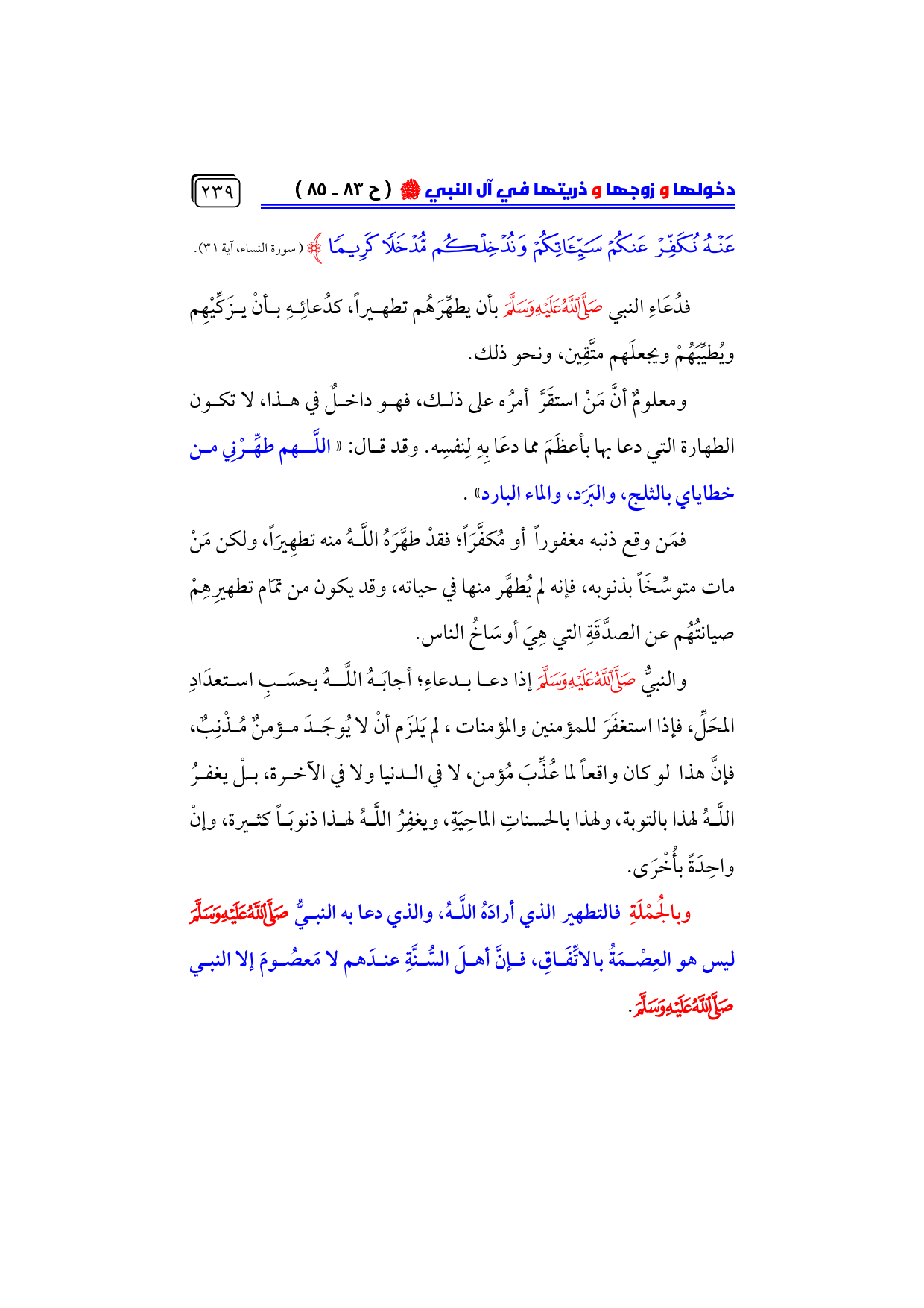 وبالجُمْلَةِ فالتطهير الذي أرادَهُ اللَّهُ، والذي دعا به النبيُّ - صلى الله عليه وسلم - ليس هو العِصْمَةُ بالاتِّفَاقِ، فإنَّ أهلَ السُّنَّةِ عندَهم لا مَعصُومَ إلا النبي - صلى الله عليه وسلم -.