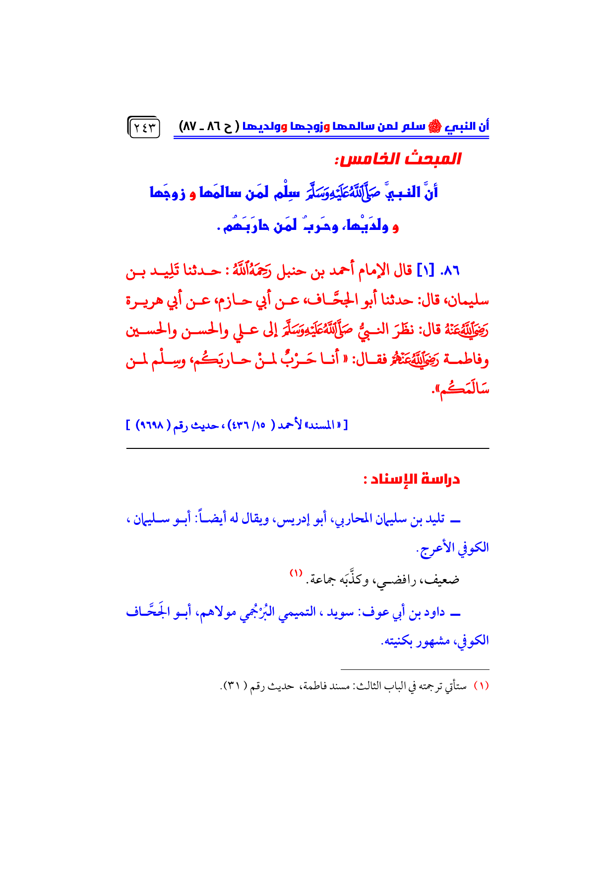 ٨٦. [١] قال الإمام أحمد بن حنبل - رحمه الله -: حدثنا تَلِيد بن سليمان، قال: حدثنا أبو الجحَّاف، عن أبي حازم، عن أبي هريرة - رضي الله عنه - قال: نظَرَ النبيُّ - صلى الله عليه وسلم - إلى علي والحسن والحسين وفاطمة - رضي الله عنهم - فقال: «أنا حَرْبٌ لمنْ حاربَكُم، وسِلْم لمن سَالَمَكُم».