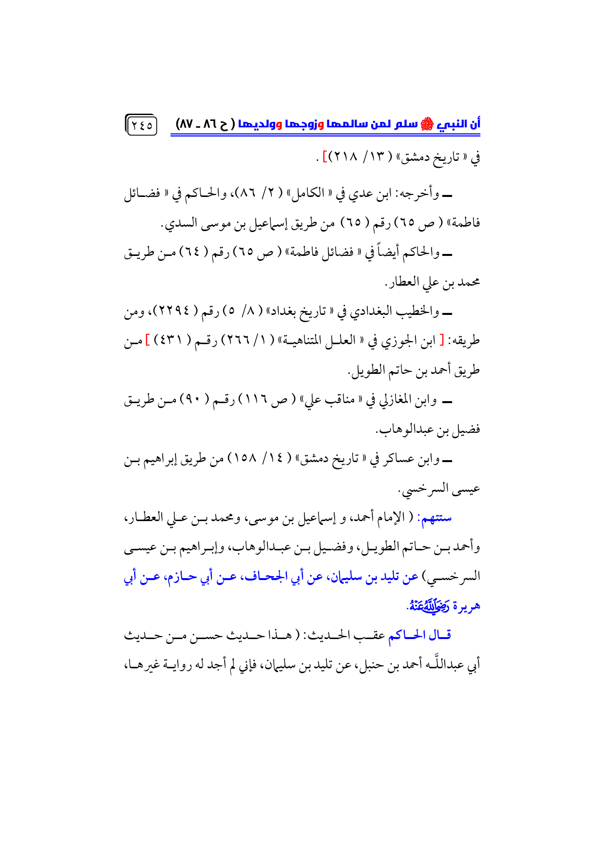 ــ وأخرجه: ابن عدي في «الكامل» (٢/ ٨٦)، والحاكم في «فضائل فاطمة» (ص ٦٥) رقم (٦٥) من طريق إسماعيل بن موسى السدي.