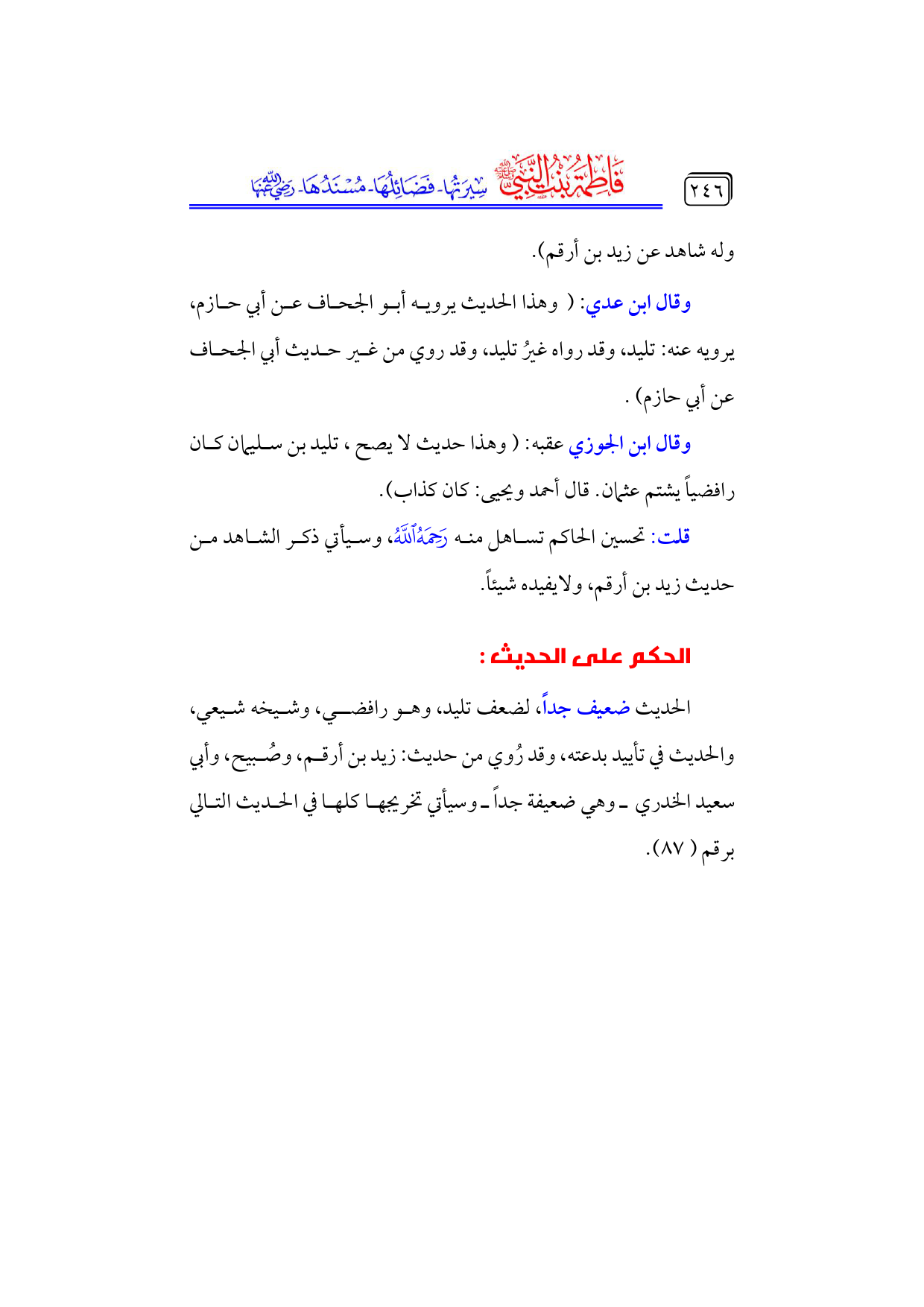 الحديث ضعيف جداً، لضعف تليد، وهو رافضي، وشيخه شيعي، والحديث في تأييد بدعته، وقد رُوي من حديث: زيد بن أرقم، وصُبيح، وأبي سعيد الخدري ـ وهي ضعيفة جداً ـ وسيأتي تخريجها كلها في الحديث التالي برقم (٨٧).