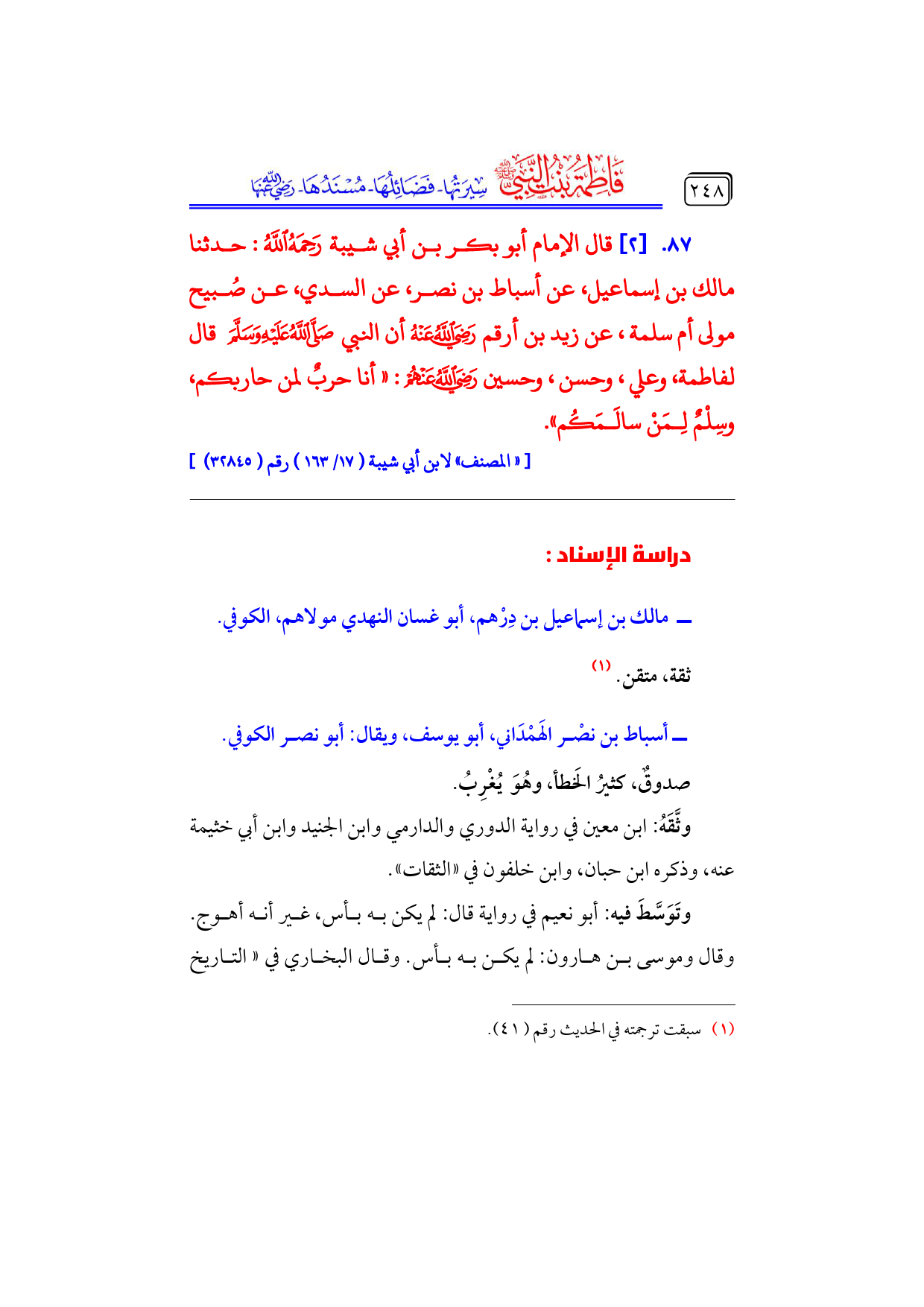 ٨٧. [٢] قال الإمام أبو بكر بن أبي شيبة - رحمه الله -: حدثنا مالك بن إسماعيل، عن أسباط بن نصر، عن السدي، عن صُبيح مولى أم سلمة، عن زيد بن أرقم - رضي الله عنه - أن النبي - صلى الله عليه وسلم - قال لفاطمة، وعلي، وحسن، وحسين - رضي الله عنهم -: «أنا حربٌ لمن حاربكم، وسِلْمٌ لِمَنْ سالَمَكُم».