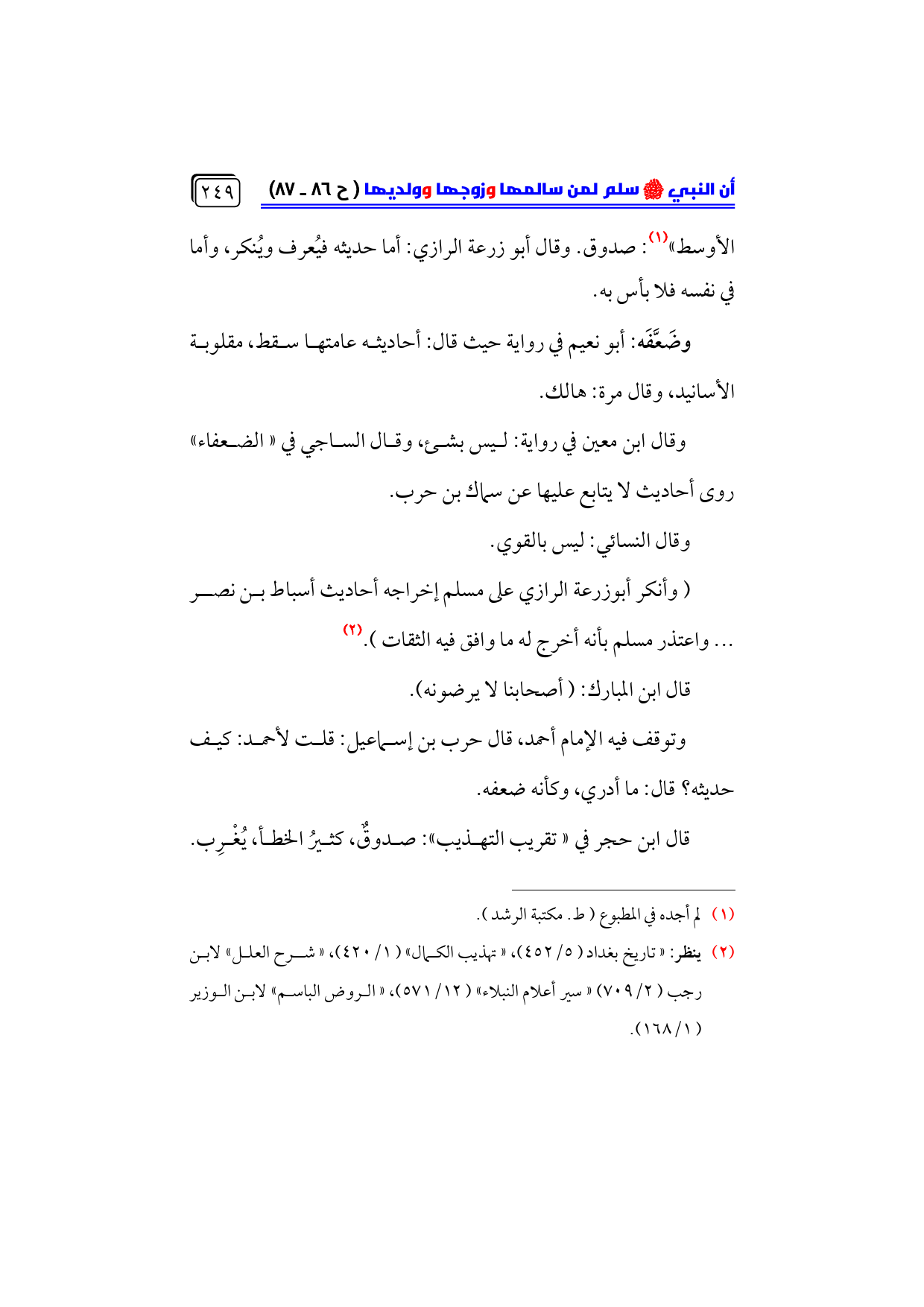 (¬٢) ينظر: «تاريخ بغداد (٥/ ٤٥٢)، «تهذيب الكمال» (١/ ٤٢٠)، «شرح العلل» لابن رجب (٢/ ٧٠٩) «سير أعلام النبلاء» (١٢/ ٥٧١)، «الروض الباسم» لابن الوزير ... (١/ ١٦٨).