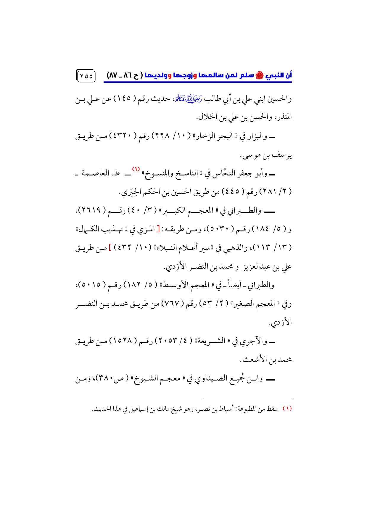 والحسين ابني علي بن أبي طالب - رضي الله عنهم -، حديث رقم (١٤٥) عن علي بن المنذر، والحسن بن علي بن الخلال.