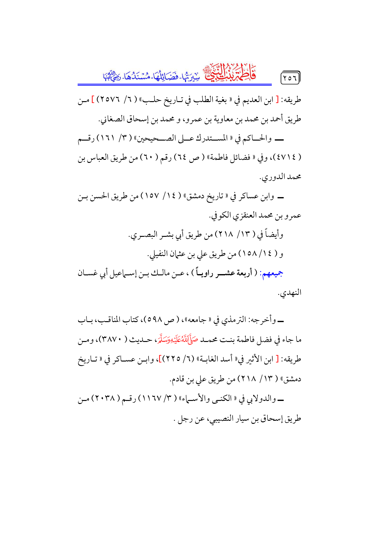 ــ وأخرجه: الترمذي في «جامعه»، (ص ٥٩٨)، كتاب المناقب، باب ما جاء في فضل فاطمة بنت محمد - صلى الله عليه وسلم -، حديث (٣٨٧٠)، ومن طريقه: [ابن الأثير في «أسد الغابة» (٦/ ٢٢٥)]، وابن عساكر في «تاريخ دمشق» (١٣/ ٢١٨) من طريق علي بن قادم.