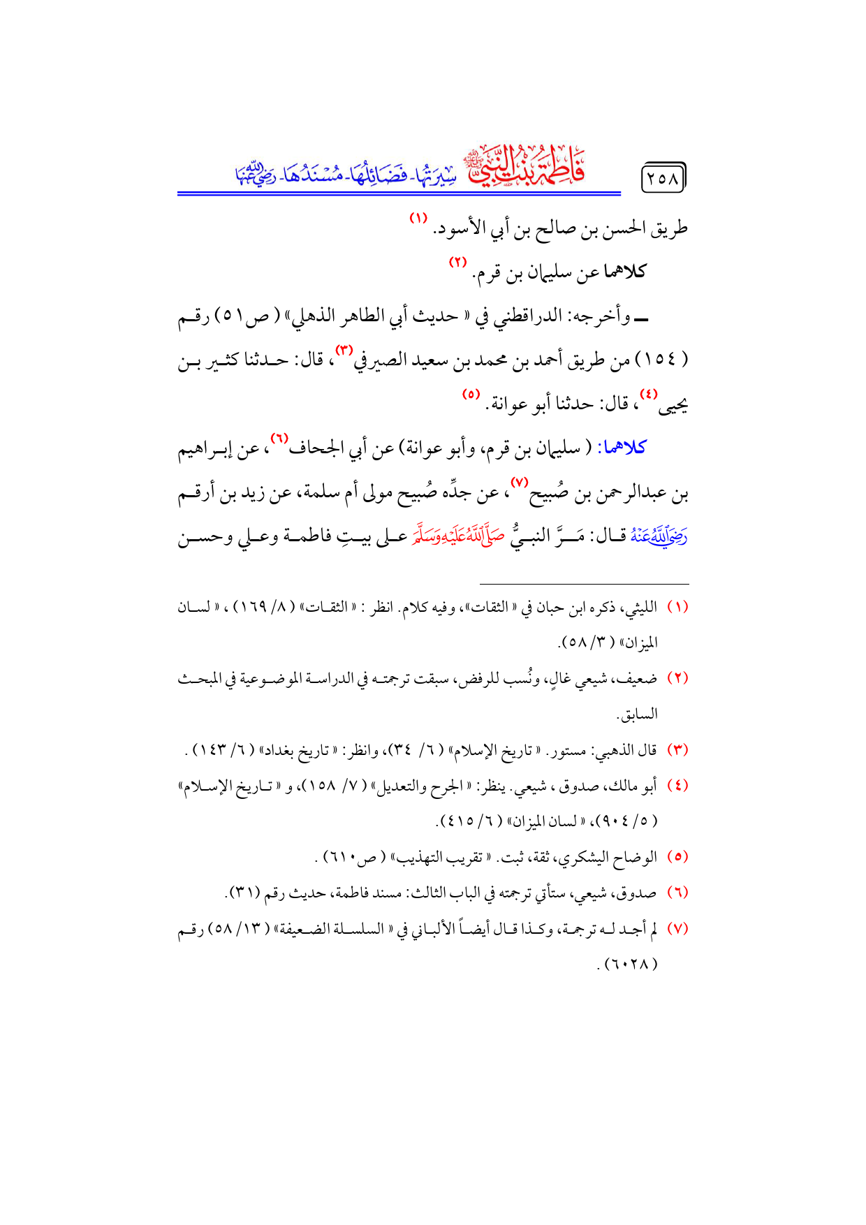 كلاهما: (سليمان بن قرم، وأبو عوانة) عن أبي الجحاف (¬٦)، عن إبراهيم بن عبدالرحمن بن صُبيح (¬٧)، عن جدِّه صُبيح مولى أم سلمة، عن زيد بن أرقم - رضي الله عنه - قال: مَرَّ النبيُّ - صلى الله عليه وسلم - على بيتِ فاطمة وعلي وحسن
