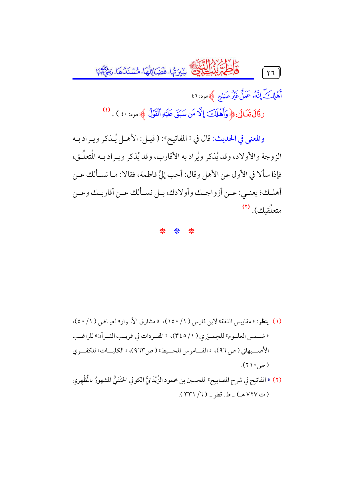 والمعنى في الحديث: قال في «المفاتيح»: (قيل: الأهل يُذكر ويراد به الزوجة والأولاد، وقد يُذكر ويُراد به الأقارب، وقد يُذكر ويراد به المُتعلِّق، فإذا سألا في الأول عن الأهل وقال: أحب إليَّ فاطمة، فقالا: ما نسألك عن أهلك؛ يعني: عن أزواجك وأولادك، بل نسألك عن أقاربك وعن متعلِّقيك). (¬٢)