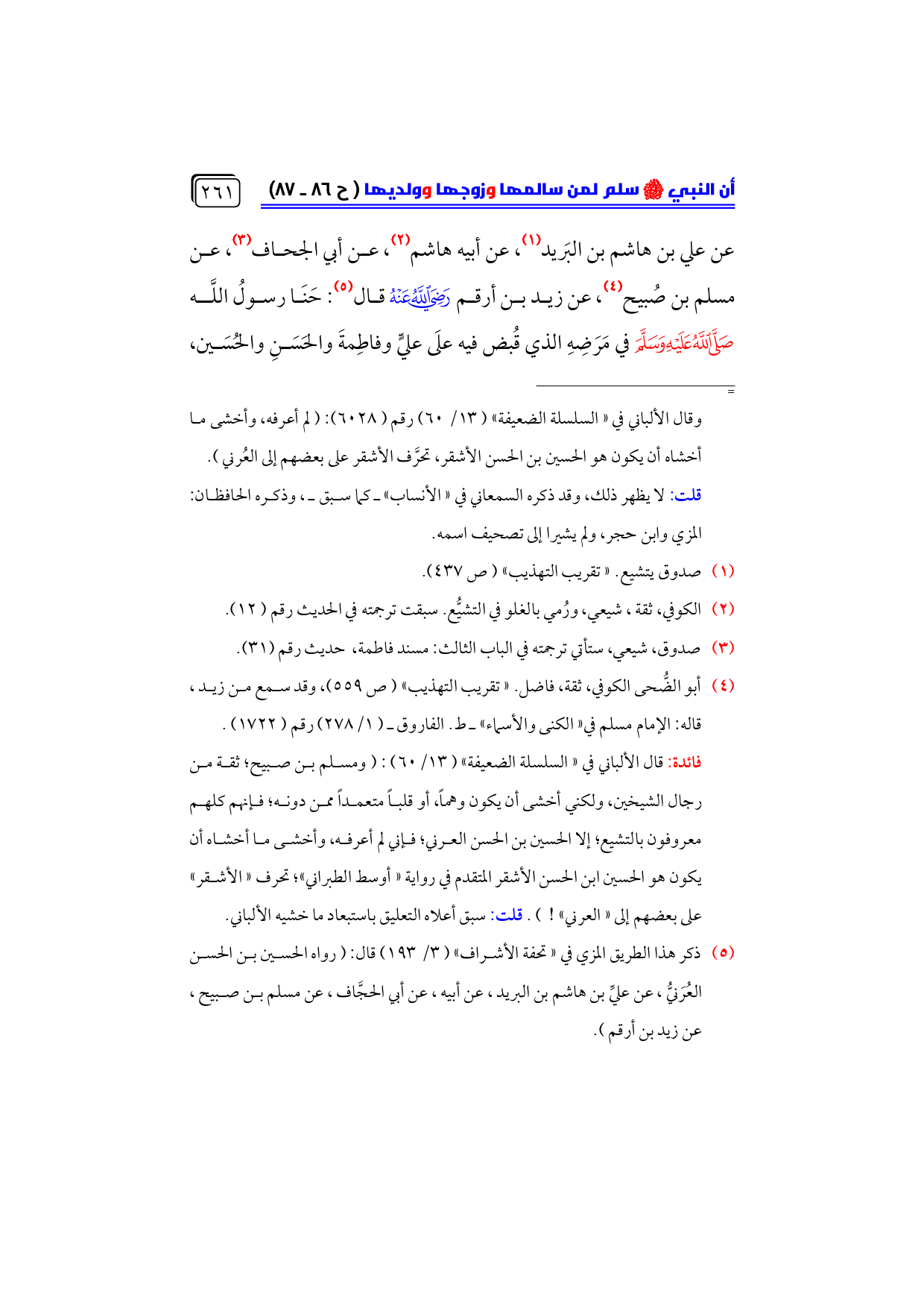 فائدة: قال الألباني في «السلسلة الضعيفة» (١٣/ ٦٠): (ومسلم بن صبيح؛ ثقة من رجال الشيخين، ولكني أخشى أن يكون وهماً، أو قلباً متعمداً ممن دونه؛ فإنهم كلهم معروفون بالتشيع؛ إلا الحسين بن الحسن العرني؛ فإني لم أعرفه، وأخشى ما أخشاه أن يكون هو الحسين ابن الحسن الأشقر المتقدم في رواية «أوسط الطبراني»؛ تحرف «الأشقر» على بعضهم إلى «العرني»! ). قلت: سبق أعلاه التعليق باستبعاد ما خشيه الألباني.