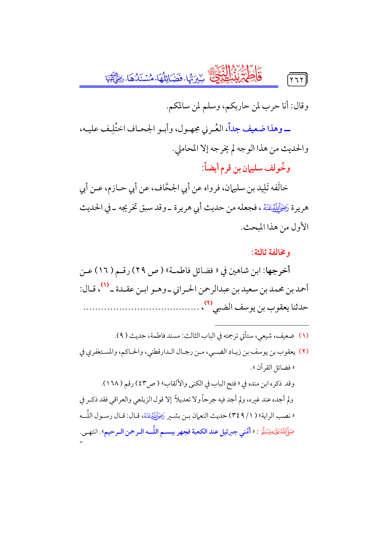 (¬١) ضعيف، شيعي، ستأتي ترجمته في الباب الثالث: مسند فاطمة، حديث (٩).