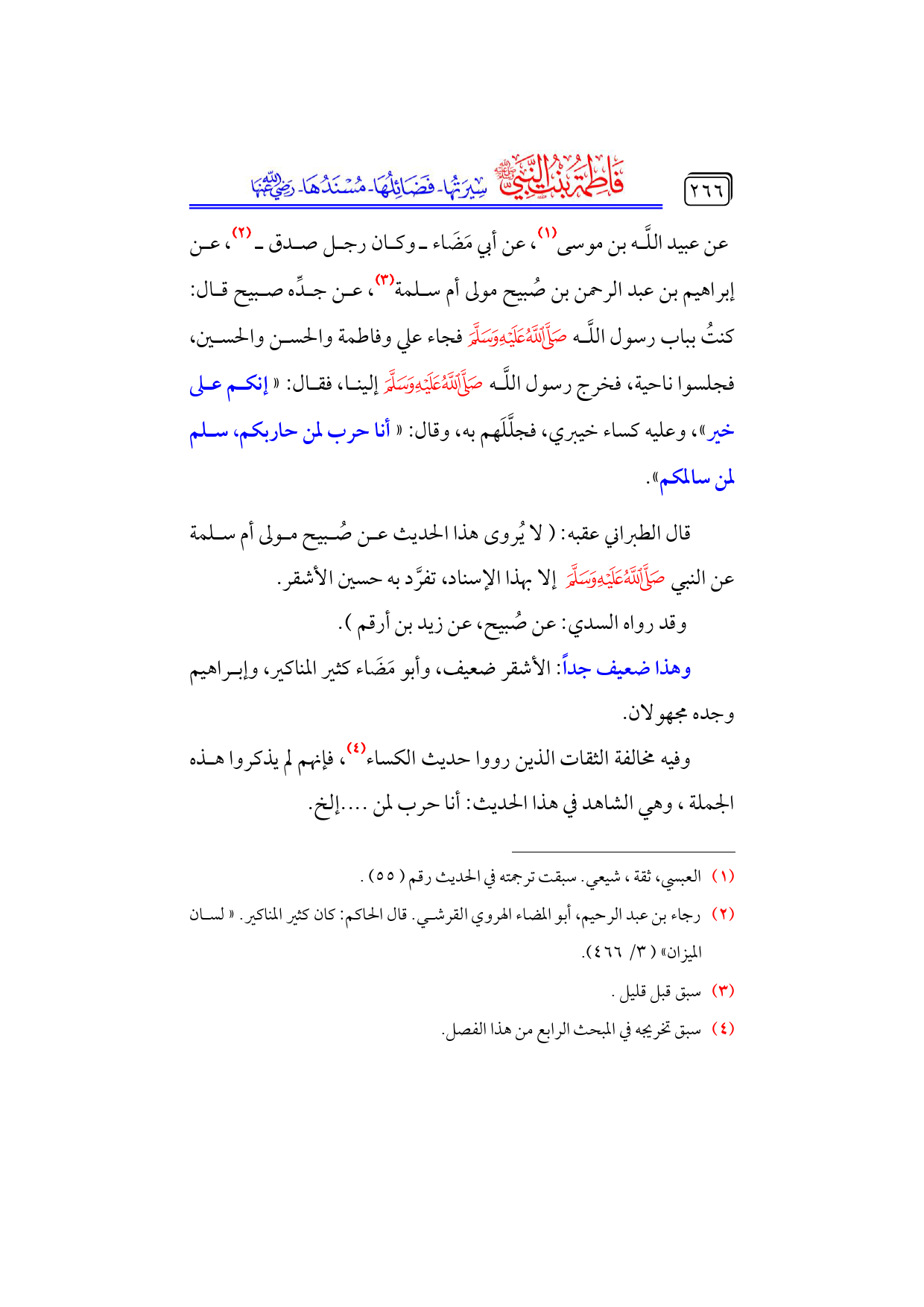 وفيه مخالفة الثقات الذين رووا حديث الكساء (¬٤)، فإنهم لم يذكروا هذه الجملة، وهي الشاهد في هذا الحديث: أنا حرب لمن .... إلخ.