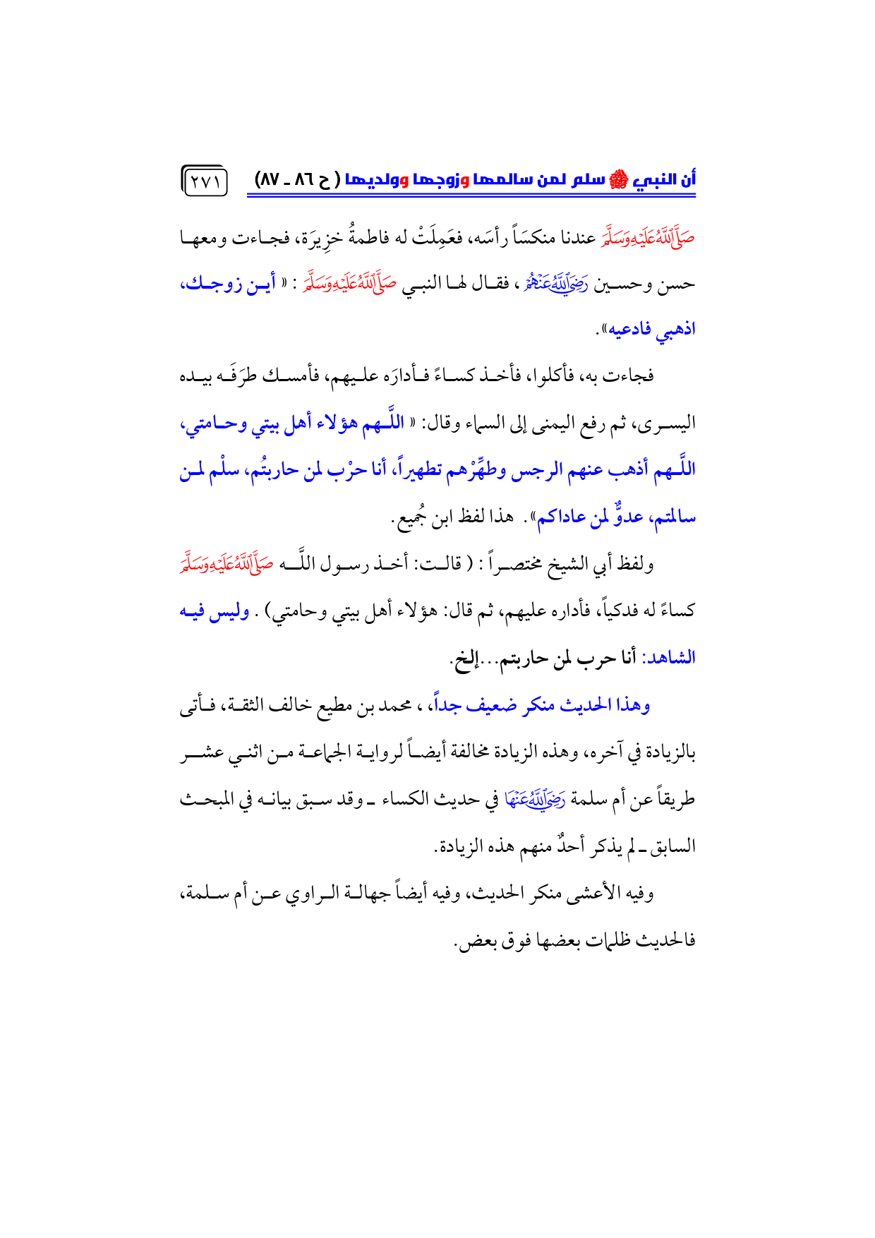 ولفظ أبي الشيخ مختصراً: (قالت: أخذ رسول اللَّه - صلى الله عليه وسلم - كساءً له فدكياً، فأداره عليهم، ثم قال: هؤلاء أهل بيتي وحامتي). وليس فيه الشاهد: أنا حرب لمن حاربتم ... إلخ.